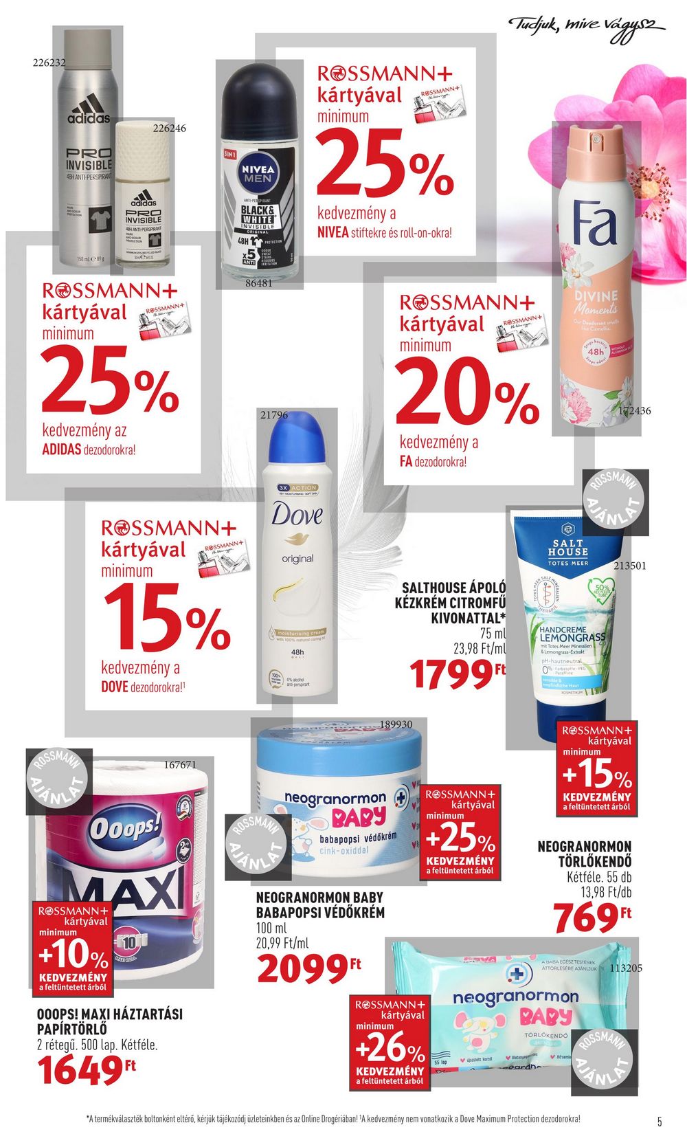 226232 adidas PRO INVISIBLE 48H ANTIPERSPIRANT 150 ml 226246 adidas PRO INVISIBLE HANT PERSPRINT ROSSMANN+ kártyával minimum 25% kedvezmény az ADIDAS dezodorokra! ROMAN+ kártyával minimum +10% KEDVEZMÉNY a feltüntetett árból ROSSMANN+ kártyával minimum 15% kedvezmény a DOVE dezodorokra!¹ 10 BALD HA Ooops! MAX 167671 000PS! MAXI HÁZTARTÁSI PAPÍRTÖRLŐ 2 rétegű. 500 lap. Kétféle. 1649Ft NIVEA MEN BLACK& WHITE INVISIBLE 48H 5 X ROSSMANN+ th ANTI 86481 21796 Dove original ROSSMANN+ kártyával minimum T moisturising cream 48h 25% kedvezmény a NIVEA stiftekre és roll-on-okra! ROSSMANN+ NEOGRANORMON BABY BABAPOPSI VÉDŐKRÉM 100 ml 20,99 Ft/ml 2099Ft 1 neogranormon BABY babapopsi védőkrém cink-oxiddal 189930 ROSSMANN+ kártyával minimum 20% kedvezmény a FA dezodorokra! SALTHOUSE ÁPOLÓ KÉZKRÉM CITROMFŰ KIVONATTAL* 75 ml 23,98 Ft/ml 1799Ft ROSSMANN+ kártyával minimum +25% KEDVEZMÉNY a feltüntetett árból ROSSMANN+ kártyával Tudjuk, mive vágysz ROSSMANN+ minimum +26% KEDVEZMÉNY a feltüntetett árból ✔ Fa DIVINE Moments Our Deadrat me Camelia SALT HOUSE TOTES MEER -eardhe HANDCREME LEMONGRASS mit Totes Meer Mineralien & Lemongrass-Extrakt pH-hautneutral Paratione 48h % PEG Mike & ROSMETUM ROSSMANN neogranormon BABY TÖRLOKENDO 172436 ROSSMANN+ kártyával A BABA ECESZ TESTENEK ATTORLESERE AJÁNLJUK minimum +15% KEDVEZMÉNY a feltüntetett árból NEOGRANORMON TÖRLŐKENDŐ Kétféle. 55 db 13,98 Ft/db 769 Ft *A termékválaszték boltonként eltérő, kérjük tájékozódj üzleteinkben és az Online Drogériában! ‘A kedvezmény nem vonatkozik a Dove Maximum Protection dezodorokra! 213501 113205 5