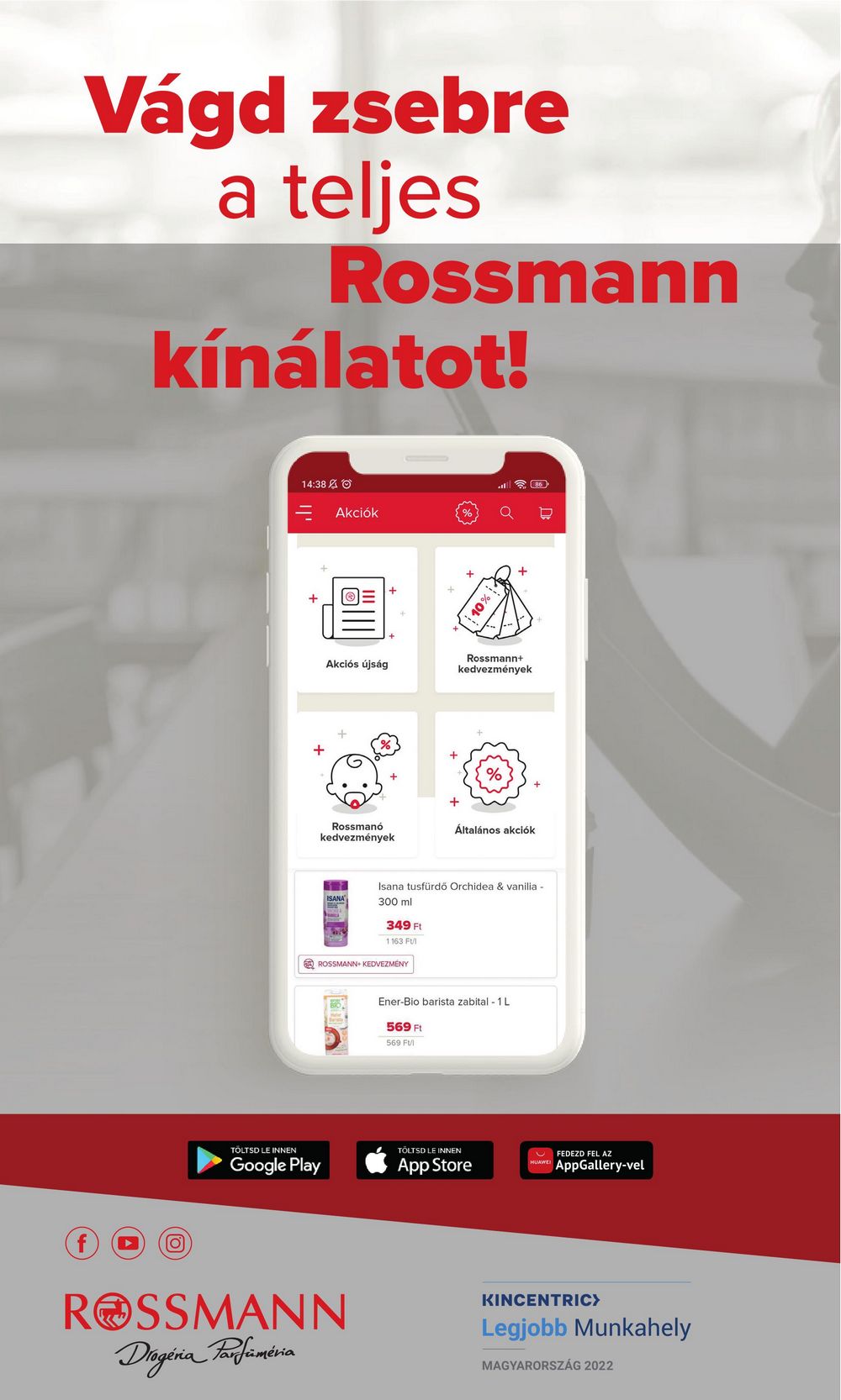 Vágd zsebre a teljes Rossmann kínálatot! O 14:38 O Akciók Akciós újság Rossmanó kedvezmények TOLTSD LE INNEN Google Play 601 ISANA ROSSMANN+KEDVEZMÉNY ROSSMANN Drogéria Parfüméria 349 Ft 1163 Ful + Isana tusfürdő Orchidea & vanilia – 300 ml 569 Ft 569 FUI 10% Rossmann+ kedvezmények Általános akciók Ener-Bio barista zabital – 1 L TÖLTSD LE INNEN App Store FEDEZD FEL AZ HUAWE AppGallery-vel KINCENTRIC> Legjobb Munkahely MAGYARORSZÁG 2022