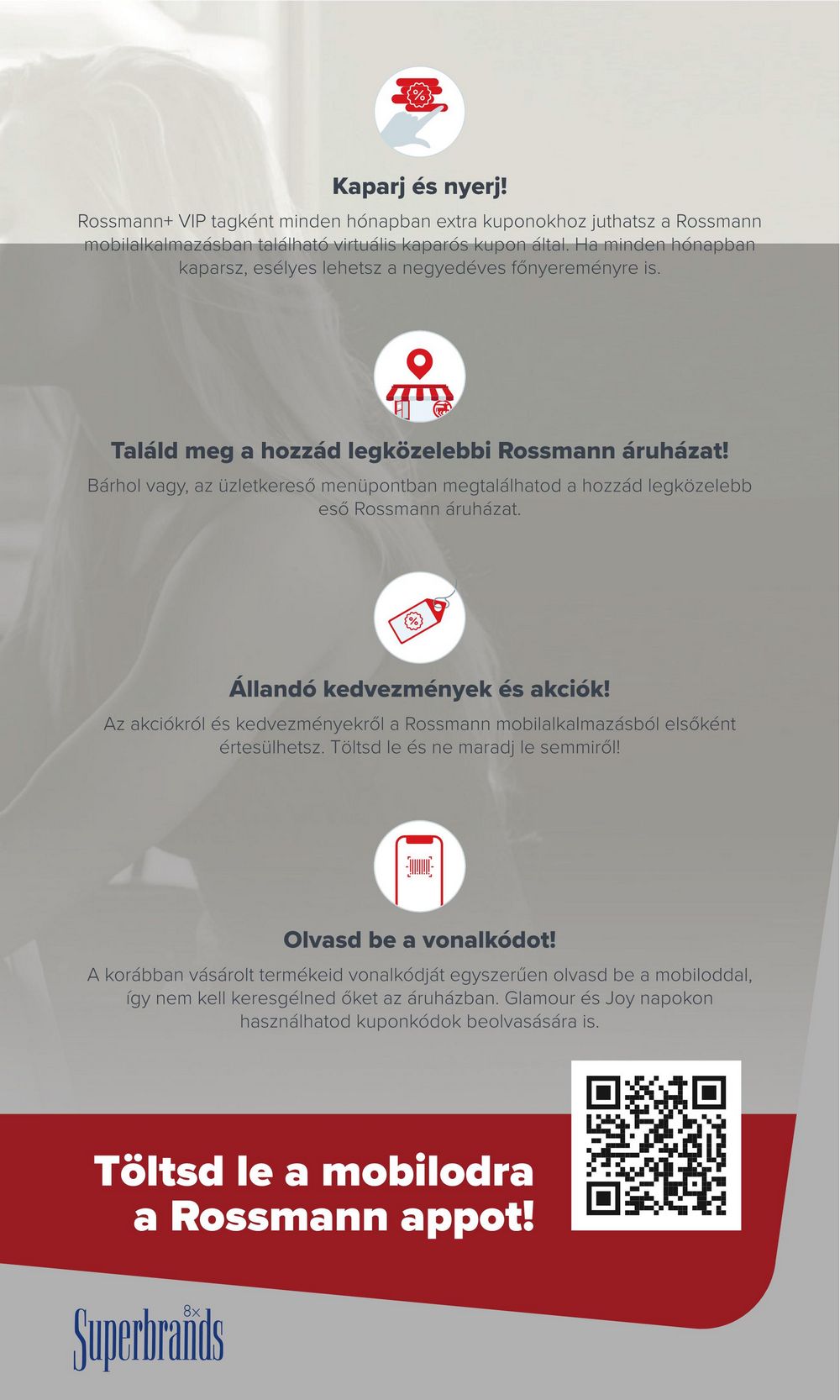 Kaparj és nyerj! Rossmann+ VIP tagként minden hónapban extra kuponokhoz juthatsz a Rossmann mobilalkalmazásban található virtuális kaparós kupon által. Ha minden hónapban kaparsz, esélyes lehetsz a negyedéves főnyereményre is. Találd meg a hozzád legközelebbi Rossmann áruházat! Bárhol vagy, az üzletkereső menüpontban megtalálhatod a hozzád legközelebb eső Rossmann áruházat. Állandó kedvezmények és akciók! Az akciókról és kedvezményekről a Rossmann mobilalkalmazásból elsőként értesülhetsz. Töltsd le és ne maradj le semmiről! Olvasd be a vonalkódot! A korábban vásárolt termékeid vonalkódját egyszerűen olvasd be a mobiloddal, így nem kell keresgélned őket az áruházban. Glamour és Joy napokon használhatod kuponkódok beolvasására is. Töltsd le a mobilodra a Rossmann appot! Superbrands