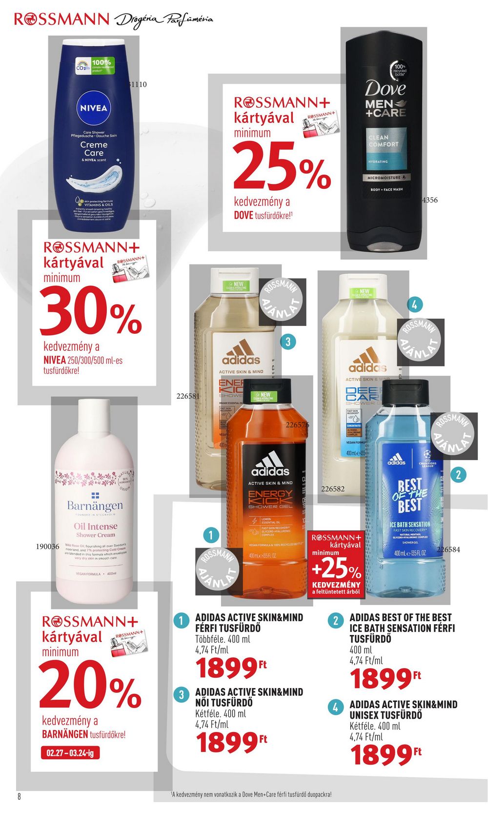 ROSSMANN Drogéria Parfüméria 8 CO₂ 100% Sport NIVEA 190036 Care Shower Pflegedusche Douche Soin Creme Care & NIVEA scent skin protecting formul VITAMINS & OILS ROSSMANN+ kártyával minimum 30% kedvezmény a NIVEA 250/300/500 ml-es tusfürdőkre! ROSSMANN+ ********* ( $1110 NATURA = Barnängen FOUNDED IN STOCKHOLM Oil Intense Shower Cream VEGAN FORMULA 400ml ORIGIN Wild Rose Oil, flourishing all over Sweden noorland, and 7% protecting Cold Cream are blended in this formula which envelopes vary dry y skin in smooth care ROSSMANN+ kártyával minimum ROSSMANN+ 20% kedvezmény a BARNÄNGEN tusfürdőkre! 02.27-03.24-ig 226581 1 ROSSMANN+ kártyával minimum NEW 25% kedvezmény a DOVE tusfürdőkre!¹ adidas ACTIVE SKIN & MIND ENER SHOWE NEW 3 adidas ACTIVE SKIN & MIND 226576 ENERGY 4 ESSENTIAL D SHOWER GEL VEGAN FORMULA & 100% RECYCLES BO 400 mL-155FL 012 ROSSMANN+ ADIDAS ACTIVE SKIN&MIND TUSFÜRDŐ Többféle. 400 ml 4,74 Ft/ml 1899Ft 3 ADIDAS ACTIVE SKIN&MIND NŐI TUSFÜRDŐ Kétféle. 400 ml 4,74 Ft/ml 1899Ft t 226582 Dove MEN +CARE ¹A kedvezmény nem vonatkozik a Dove Men+Care férfi tusfürdő duopackra! ROSSMANN+ kártyával NEW 400mLe-135 CLEAN COMFORT HYDRATING minimum +25% KEDVEZMÉNY a feltüntetett árból adidas ACTIVE SKIN & MIND 100% recycled MICROMOISTURE SHOWER BODY + FACE WASH 4356 4 ROSSMANN TANLE adidas 63 CHAMPIONS BEST OF THE BEST ROSSMANN ICE BATH SENSATION FAST SKIN RECOVERY NATURALMENT SHOWER GEL 400 mLe 135 FLOZ EMTA 2 226584 2 ADIDAS BEST OF THE BEST ICE BATH SENSATION FÉR TUSFÜRDŐ 400 ml 4,74 Ft/ml 1899Ft 4 ADIDAS ACTIVE SKIN&MIND UNISEX TUSFÜRDŐ Kétféle. 400 ml 4,74 Ft/ml 1899Ft