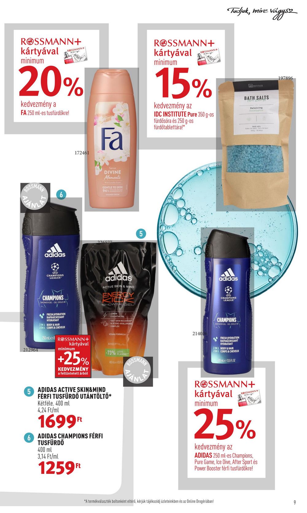 ROSSMANN+ kártyával minimum 20% kedvezmény a FA 250 ml-es tusfürdőkre! ROSSMAN 212964 5 6 adidas CHAMPIONS LEAGUE M CHAMPIONS SHOWER GEL GEL DOUCHE FRESH HYDRATION RAFRAÎCHISSANT HYDRATANT RES 2 IN 1 BODY & HAIR 2 EN1 CORPS & CHEVEUX 172461 250 mLe8 ROSSMANN + kártyával minimum +25% KEDVEZMÉNY a feltüntetett árból Fa Sense DIVINE Moments GENTLE TO SKIN 94% adidas ACTIVE SKIN & MIND ENERGY SHOWER GEL 6 ADIDAS CHAMPIONS FÉRFI TUSFÜRDŐ 400 ml 3,14 Ft/ml 1259Ft LEMON ESSENTIAL OIL FAST SKIN RECOVERY GLYCERO-HYALURONIC COMPLEX VEGAN FORMULA REFILL -73% LESS ADIDAS ACTIVE SKIN&MIND FÉRFI TUSFÜRDŐ UTÁNTÖLTŐ* Kétféle. 400 ml 4,24 Ft/ml 1699Ft O PLASTIC 430ml+135 FL 5 ROSSMANN+ kártyával minimum ROSSMANN+ the 15% kedvezmény az IDC INSTITUTE Pure 350 g-os fürdősóra és 250 g-os fürdőtablettára!* 214036 Tudjuk, mive vágysz adidas CHAMPIONS LEAGUE *A termékválaszték boltonként eltérő, kérjük tájékozódj üzleteinkben és az Online Drogériában! CHAMPIONS SHOWER GEL GEL DOUCHE FRESH HYDRATION RAFRAÎCHISSANT HYDRATANT 2 IN 1 BODY & HAIR ZEN1 CORPS & CHEVEUX 400mLe 13.5 FLOZ UDCINSTITUTE BATH SALTS Balancing Eucalyptus Acade ROSSMANN+ kártyával minimum ROSSMANN+ 25% kedvezmény az ADIDAS 250 ml-es Champions, Pure Game, Ice Dive, After Sport és Power Booster férfi tusfürdőkre! 197896 9