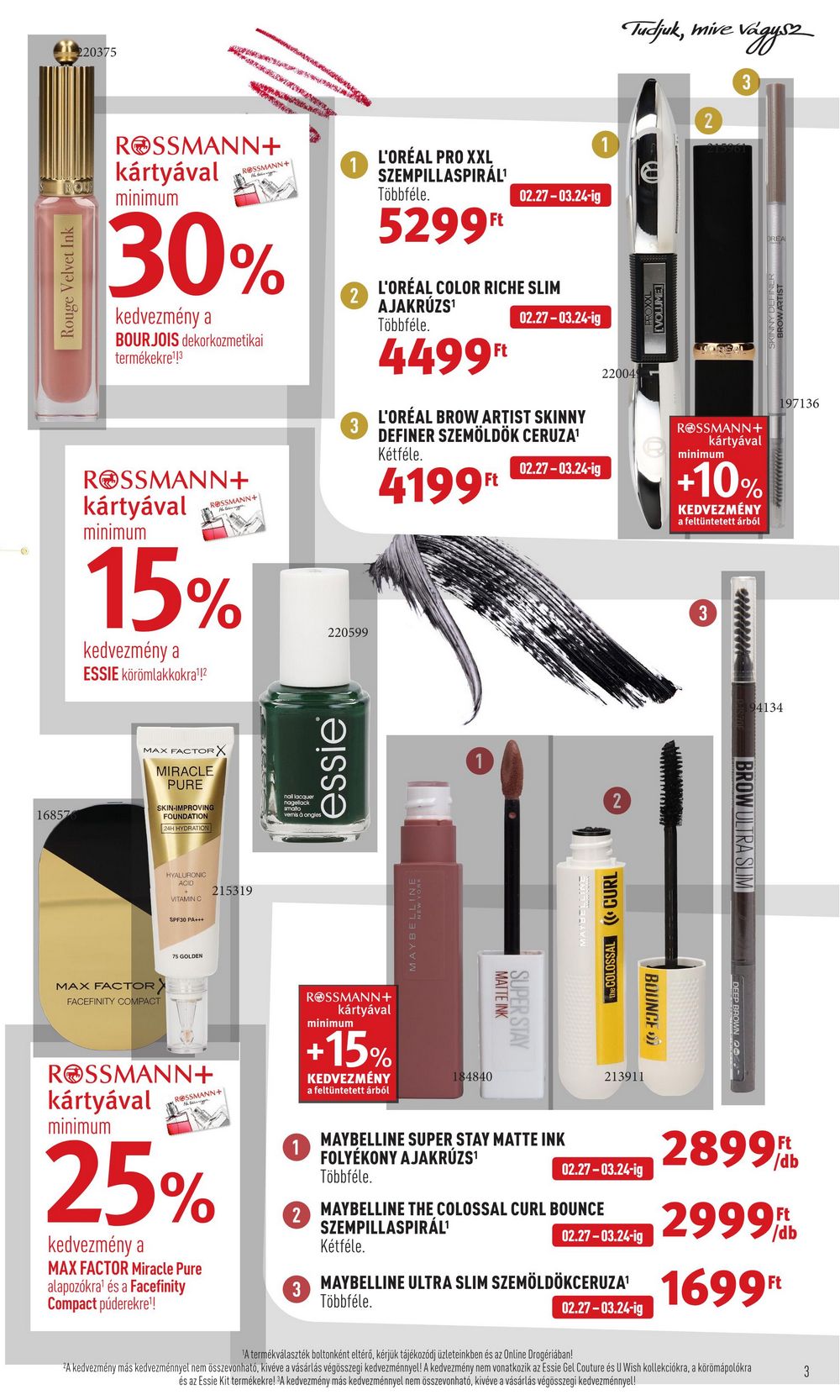 Rouge Velvet Ink 16857 220375 ROSSMANN+ kártyával minimum kedvezmény a BOURJOIS dekorkozmetikai termékekre¹!³ ROSSMANN+ kártyával minimum MAX FACTORX MIRACLE PURE SKIN-IMPROVING FOUNDATION 24H HVNGATIONI MAX FACTOR FACEFINITY COMPACT 15% kedvezmény a ESSIE körömlakkokra¹!2 HYALURONIC VITAMIN C SPF30 PA+++ AR 75 GOLDEN RN+1 ROSSMANN+ kártyával minimum ROSSMANN+ H ROSSMANN+ 215319 25% kedvezmény a MAX FACTOR Miracle Pure alapozókra és a Facefinity Compact púderekre¹! WERKING VÝLMATE AKUPRIN CHERCH essie vemis à ongle 1 2 3 220599 minimum L’ORÉAL PRO XXL SZEMPILLASPIRÁL¹ Többféle. 5299 Ft ROSSMANN + kártyával L’ORÉAL COLOR RICHE SLIM AJAKRÚZS¹ Többféle. 4499Ft Kétféle. +15% KEDVEZMÉNY a feltüntetett árból 02.27-03.24-ig L’ORÉAL BROW ARTIST SKINNY DEFINER SZEMÖLDÖK CERUZA¹ Kétféle. 02.27-03.24-ig 4199Ft MAYBELLINE 184840 02.27-03.24-ig MATTE INK SUPER STAY 22004 the COLOSSAL (CURL Tudjuk, mive vágysz 213911 2 MAYBELLINE THE COLOSSAL CURL BOUNCE SZEMPILLASPIRÁL¹ BOUNCE 02.27-03.24-ig 02.27-03.24-ig 3 MAYBELLINE ULTRA SLIM SZEMÖLDÖKCERUZA¹ Többféle. [VOLUME] 02.27-03.24-ig 3 ROSSMANN+ kártyával minimum +10% KEDVEZMÉNY a feltüntetett árból FOLYÉKONY AJAKRÚZS¹ Többféle. MAYBELLINE SUPER STAY MATTE INK 2899db PRE DEEP BROWN BROW ULTRA SLIM 194134 197136 2999 1699Ft ‘A termékválaszték boltonként eltérő, kérjük tájékozódj üzleteinkben és az Online Drogériában! A kedvezmény más kedvezménnyel nem összevonható, kivéve a vásárlás végösszegi kedvezménnyel! A kedvezmény nem vonatkozik az Essie Gel Couture és U Wish kollekciókra, a körömápolókra és az Essie Kit termékekre! A kedvezmény más kedvezménnyel nem összevonható, kivéve a vásárlás végösszegi kedvezménnyel! 3