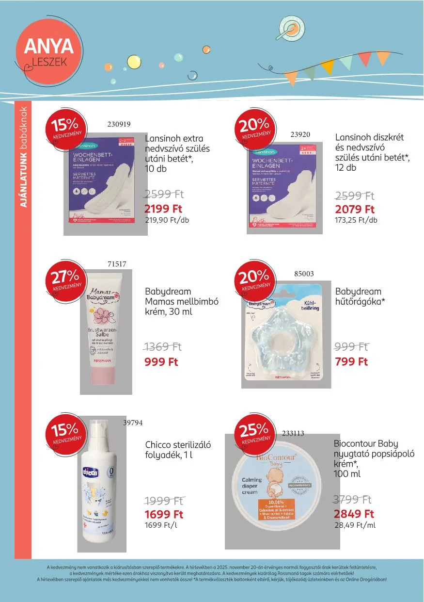 A kedvezmény nem vonatkozik a kiárusításban szereplő termékekre. A hírlevélben a 2025. november 20-án érvényes normál fogyasztói árak kerültek feltüntetésre, a kedvezmények mértéke ezen árakhoz viszonyítva került meghatározásra. A kedvezmények kizárólag Rossmann tagok számára elérhetőek! A hírlevélben szereplő ajánlatok más kedvezményekkel nem vonhatók össze. A termékválaszték boltonként eltérő, kérjük, tájékozódj üzleteinkben és az Online Drogériában!