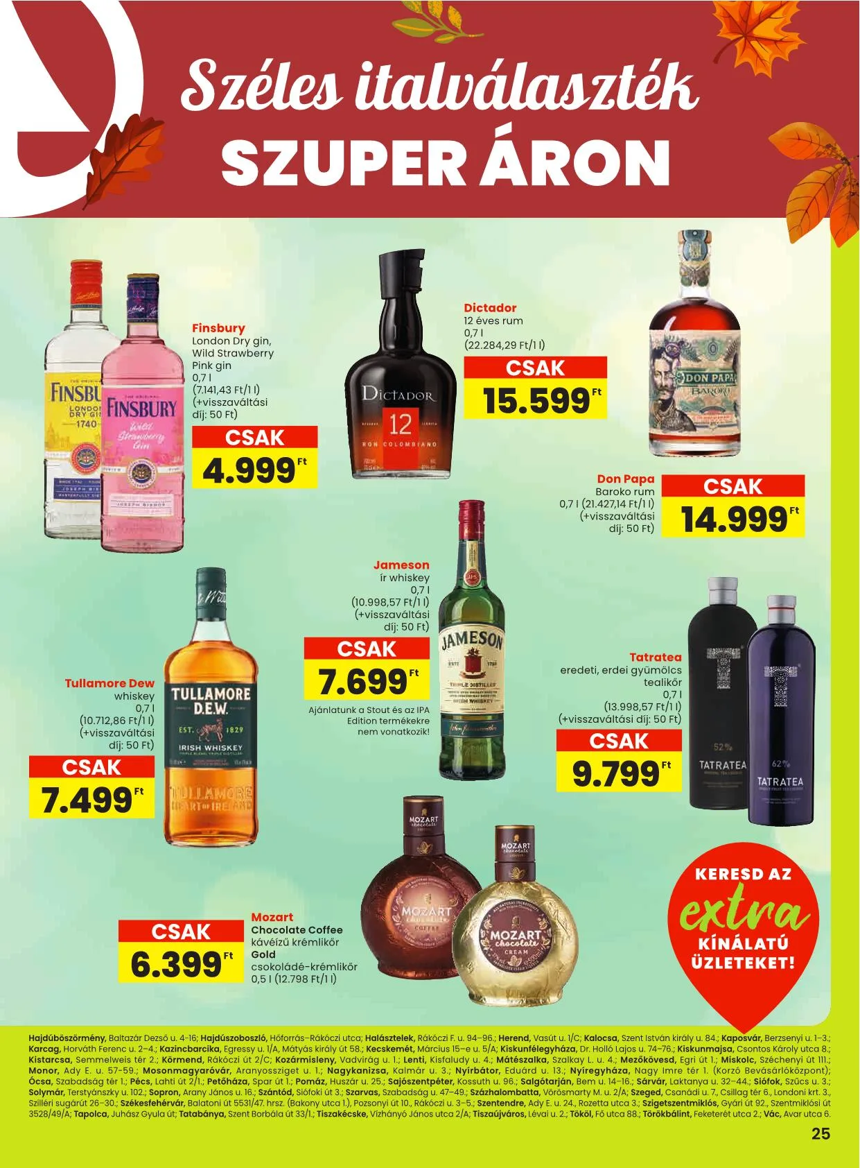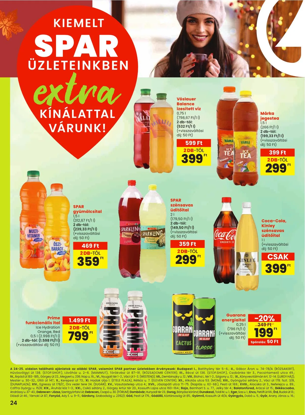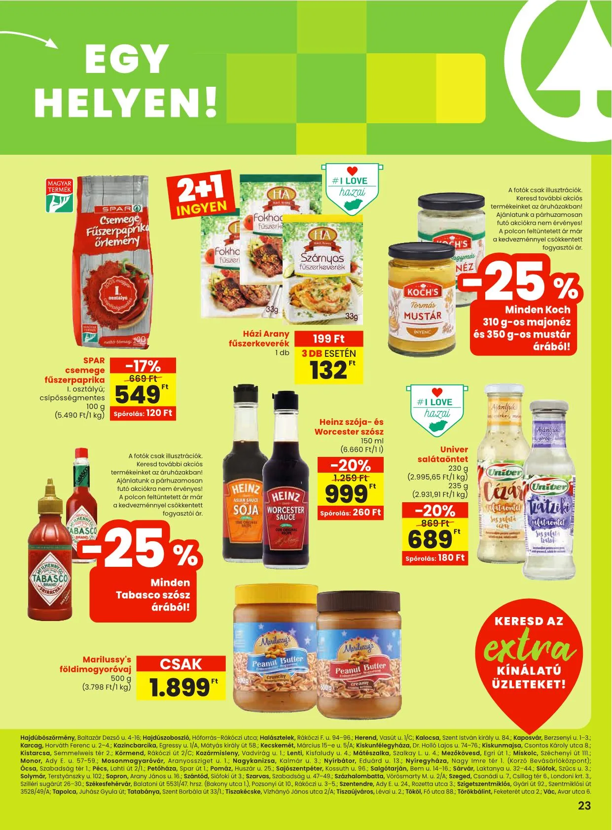 A 24-25. oldalon található ajánlatok az alábbi SPAR, valamint SPAR partner üzletekben érvényesek: Budapest I., Batthyány tér 5-6.; II., Gábor Áron u. 74-78/A (Rózsakert), Hűvösvölgyi út 138. (STOP.SHOP.), Lövőház u. 2-6. (Mammut), Törökvész út 87-91. (Rózsadomb Center); III., Bécsi út 136. (STOP.SHOP.), Csobánka tér 3., Pacsirtamező utca 49.; IV., Árpád út 183-185., Görgey út 22., Megyeri u. 236. Nap u. 16., VI., Nyugati tér 1-2., Váci út 1-3. (Westend); VII., Dembinszky u. 12.; VIII., Blaha L. tér 1-2., Szigony u. 12.; IX., Könyves Kálmán krt. 12-14. (Lurdy Ház), Mester u. 30-32., Üllői út 147.; X., Kerepesi út 73.; XI. Hadak útja 1. (Etele Plaza), Rétköz u. 7. (Eleven Center); XII., Alkotás utca 53. (MOM); XIII., Gyöngyösi sétány 2., Váci út 178. fszt. 3/B, (Dunaplaza); XIV., Egressy út 178/C, Örs vezér tere 24. (Sugár); XV., Vasutastelep utca 4.; XVII., Jászapáti utca 71-75. (Naplás u. 62-68.), Pesti út 169.; XVIII., Alacska út 3., Nefelejcs u. 89., Cziffra György u. 15/B; XIX., Áruház köz 1-3.; XXI., Csikó sétány 2., Görgey Artúr tér 20., Kossuth Lajos utca 160-164.; Baja, Bernhart S. u. 77., Jelky tér 4.; Balatonfüred, Arácsi út 15.; Békéscsaba, Andrássy u. 37-43.; Debrecen-Józsa, Szentgyörfalvi út; Debrecen, Csapó u. 30. (Fórum); Dombóvár, Hunyadi tér 23.; Dorog, Bányász körönd; Dunakeszi, Toldi M. u. 1.; Eger, Sas u. 1.; Encs, Petőfi út 66.; Érd, Budai út 13.; Diósdi út 46.; Tárnoki út 87.; Fonyód, Ady E. u. 9-11.; Gárdony, Szabadság u. 2392/1; Göd, Pesti út 176.; Gödöllő, Köztársaság út 85.; Gyömrő, Kossuth út 41/A; Gyöngyös, Dobó u. 5.; Győr, Arany János u. 16.;