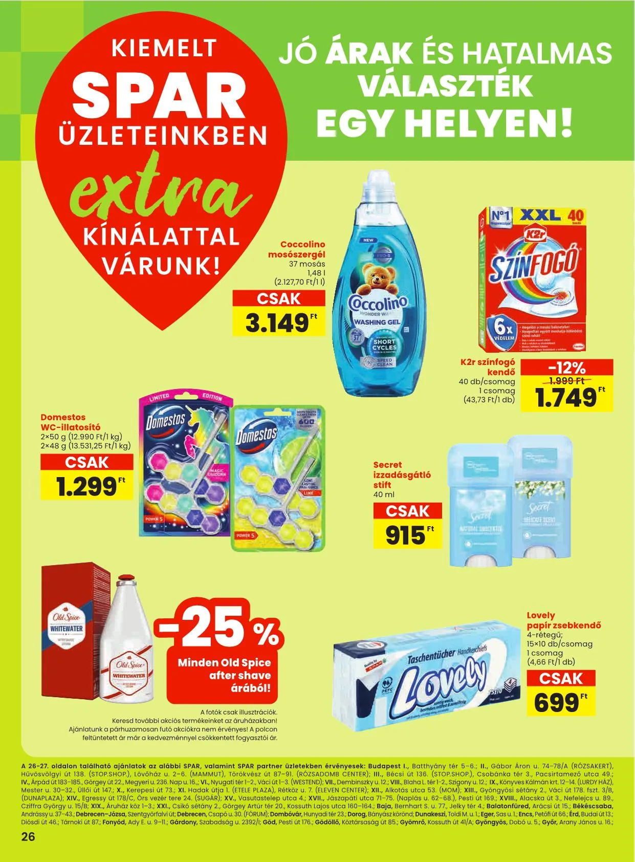 A 24-25. oldalon található ajánlatok az alábbi SPAR, valamint SPAR partner üzletekben érvényesek: Budapest I., Batthyány tér 5-6.; II., Gábor Áron u. 74-78/A (Rózsakert), Hűvösvölgyi út 138. (STOP.SHOP.), Lövőház u. 2-6. (Mammut), Törökvész út 87-91. (Rózsadomb Center); III., Bécsi út 136. (STOP.SHOP.), Csobánka tér 3., Pacsirtamező utca 49.; IV., Árpád út 183-185., Görgey út 22., Megyeri u. 236. Nap u. 16., VI., Nyugati tér 1-2., Váci út 1-3. (Westend); VII., Dembinszky u. 12.; VIII., Blaha L. tér 1-2., Szigony u. 12.; IX., Könyves Kálmán krt. 12-14. (Lurdy Ház), Mester u. 30-32., Üllői út 147.; X., Kerepesi út 73.; XI. Hadak útja 1. (Etele Plaza), Rétköz u. 7. (Eleven Center); XII., Alkotás utca 53. (MOM); XIII., Gyöngyösi sétány 2., Váci út 178. fszt. 3/B, (Dunaplaza); XIV., Egressy út 178/C, Örs vezér tere 24. (Sugár); XV., Vasutastelep utca 4.; XVII., Jászapáti utca 71-75. (Naplás u. 62-68.), Pesti út 169.; XVIII., Alacska út 3., Nefelejcs u. 89., Cziffra György u. 15/B; XIX., Áruház köz 1-3.; XXI., Csikó sétány 2., Görgey Artúr tér 20., Kossuth Lajos utca 160-164.; Baja, Bernhart S. u. 77., Jelky tér 4.; Balatonfüred, Arácsi út 15.; Békéscsaba, Andrássy u. 37-43.; Debrecen-Józsa, Szentgyörfalvi út; Debrecen, Csapó u. 30. (Fórum); Dombóvár, Hunyadi tér 23.; Dorog, Bányász körönd; Dunakeszi, Toldi M. u. 1.; Eger, Sas u. 1.; Encs, Petőfi út 66.; Érd, Budai út 13.; Diósdi út 46.; Tárnoki út 87.; Fonyód, Ady E. u. 9-11.; Gárdony, Szabadság u. 2392/1; Göd, Pesti út 176.; Gödöllő, Köztársaság út 85.; Gyömrő, Kossuth út 41/A; Gyöngyös, Dobó u. 5.; Győr, Arany János u. 16.;