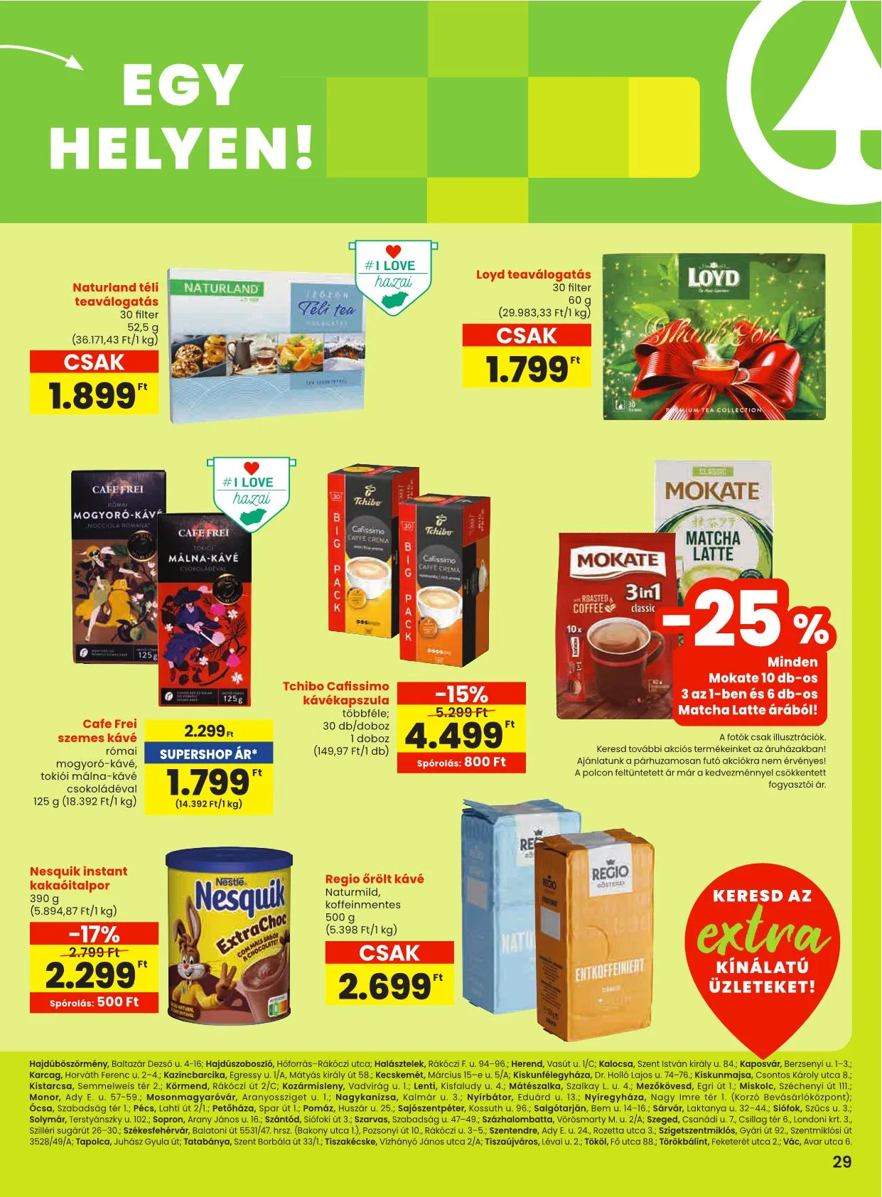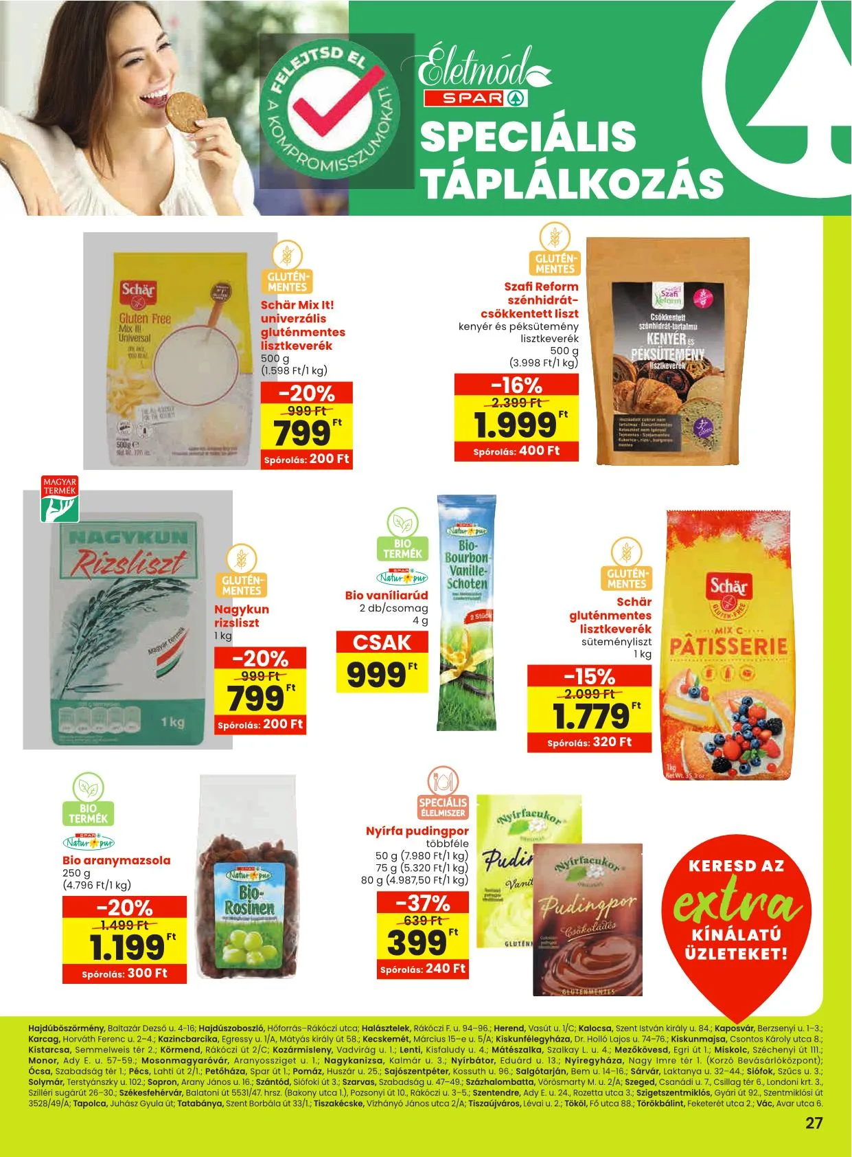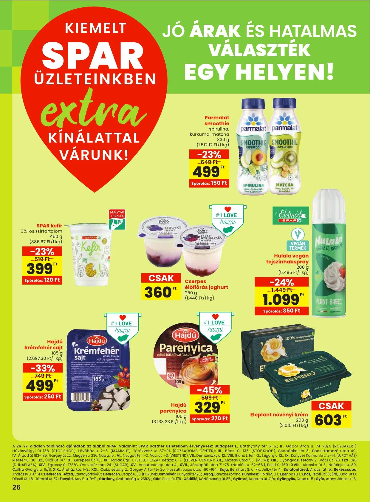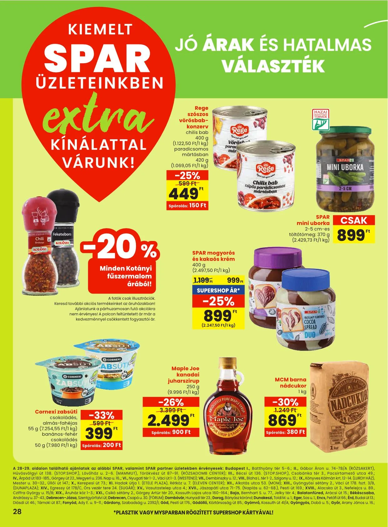A 28-29. oldalon található ajánlatok az alábbi SPAR, valamint SPAR partner üzletekben érvényesek: Budapest I. – Batthyány tér 5-6.; II. – Gábor Áron u. 74-78/A (Rózsakert), Hűvösvölgyi út 138. (STOP.SHOP.), Lövőház u. 2-6. (Mammut), Törökvész út 87-91. (Rózsadomb Center); III. – Bécsi út 136. (STOP.SHOP.), Csobánka tér 3., Pacsirtamező utca 49.; IV. – Árpád út 183-185., Görgey út 22., Megyeri u. 236., Nap u. 16.; VI. – Nyugati tér 1-2., Váci út 1-3. (Westend); VII. – Dembinszky u. 12.; VIII. – Blaha L. tér 1-2., Szigony u. 12.; IX. – Könyves Kálmán krt. 12-14. (Lurdy Ház); Mester u. 30-32., Üllői út 147.; X. – Kerepesi út 73.; XI. – Hadak útja 1. (Etele Plaza), Rétköz u. 7. (Eleven Center); XII. – Alkotás utca 53. (MOM); XIII. – Gyöngyösi sétány 2., Váci út 178. fszt. 3/B (Dunaplaza); XIV. – Egressy út 178/C, Örs vezér tere 24. (Sugár); XV. – Vasutastelep utca 4.; XVII. – Jászapáti utca 71-75. (Naplás u. 62-68.), Pesti út 169.; XVIII. – Alacska út 3., Nefelejcs u. 89., Cziffra György u. 15/B; XIX. – Áruház köz 1-3.; XXI. – Csikó sétány 2., Görgey Artúr tér 20., Kossuth Lajos utca 160-164.; Baja, Bernhart S. u. 77., Jelky tér 4.; Balatonfüred, Arácsi út 15.; Békéscsaba, Andrássy u. 37-43.; Debrecen-Józsa, Szentgyörfalvi út; Debrecen, Csapó u. 30. (Fórum); Dombóvár, Hunyadi tér 23.; Dorog, Bányász körönd; Dunakeszi, Toldi M. u. 1.; Eger, Sas u. 1.; Encs, Petőfi út 66.; Érd, Budai út 13.; Diósdi út 46.; Tárnoki út 87.; Fonyód, Ady E. u. 9-11.; Gárdony, Szabadság u. 2392/1; Göd, Pesti út 176.; Gödöllő, Köztársaság út 85.; Gyömrő, Kossuth út 41/A; Gyöngyös, Dobó u. 5.; Győr, Arany János u. 16.