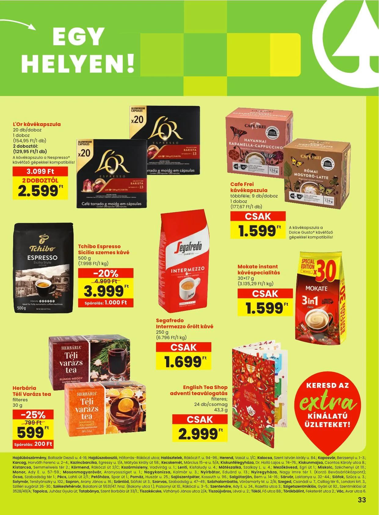 Budapest: I., Batthyány tér 5-6.; II., Gábor Áron u. 74-78/A (Rózsakert), Hűvösvölgyi út 138. (STOP.SHOP.), Lövőház u. 2-6. (Mammut), Törökvész út 87-91. (Rózsadomb Center); III., Bécsi út 136. (STOP.SHOP.), Csobánka tér 3., Pacsirtamező utca 49.; IV., Árpád út 183-185., Görgey út 22., Megyeri u. 236. Nap u. 16.; VI., Nyugati tér 1-2., Váci út 1-3. (Westend); VII., Dembinszky u. 12.; VIII., Blaha L. tér 1-2., Szigony u. 12.; IX., Könyves Kálmán krt. 12-14. (Lurdy Ház), Mester u. 30-32., Üllői út 147.; X., Kerepesi út 73.; XI., Hadak útja 1. (Etele Plaza), Rétköz u. 7. (Eleven Center); XII., Alkotás utca 53. (MOM); XIII., Gyöngyösi sétány 2., Váci út 178. fszt. 3/B (Dunaplaza); XIV., Egressy út 178/C, Örs vezér tere 24. (Sugár); XV., Vasutastelep utca 4.; XVII., Jászapáti utca 71-75. (Naplás u. 62-68.), Pesti út 169.; XVIII., Alacska út 3., Nefelejcs u. 89., Cziffra György u. 15/B; XIX., Áruház köz 1-3.; XXI., Csikó sétány 2., Görgey Artúr tér 20., Kossuth Lajos utca 160-164.; Baja, Bernhart S. u. 77., Jelky tér 4.; Balatonfüred, Arácsi út 15.; Békéscsaba, Andrássy u. 37-43.; Debrecen-Józsa, Szentgyörfalvi út; Debrecen, Csapó u. 30. (Fórum); Dombóvár, Hunyadi tér 23.; Dorog, Bányász körönd; Dunakeszi, Toldi M. u. 1.; Eger, Sas u. 1.; Encs, Petőfi út 66.; Érd, Budai út 13.; Diósdi út 46.; Tárnoki út 87.; Fonyód, Ady E. u. 9-11.; Gárdony, Szabadság u. 2392/1; Göd, Pesti út 176.; Gödöllő, Köztársaság út 85.; Gyömrő, Kossuth út 41/A; Gyöngyös, Dobó u. 5.; Győr, Arany János u. 16.;