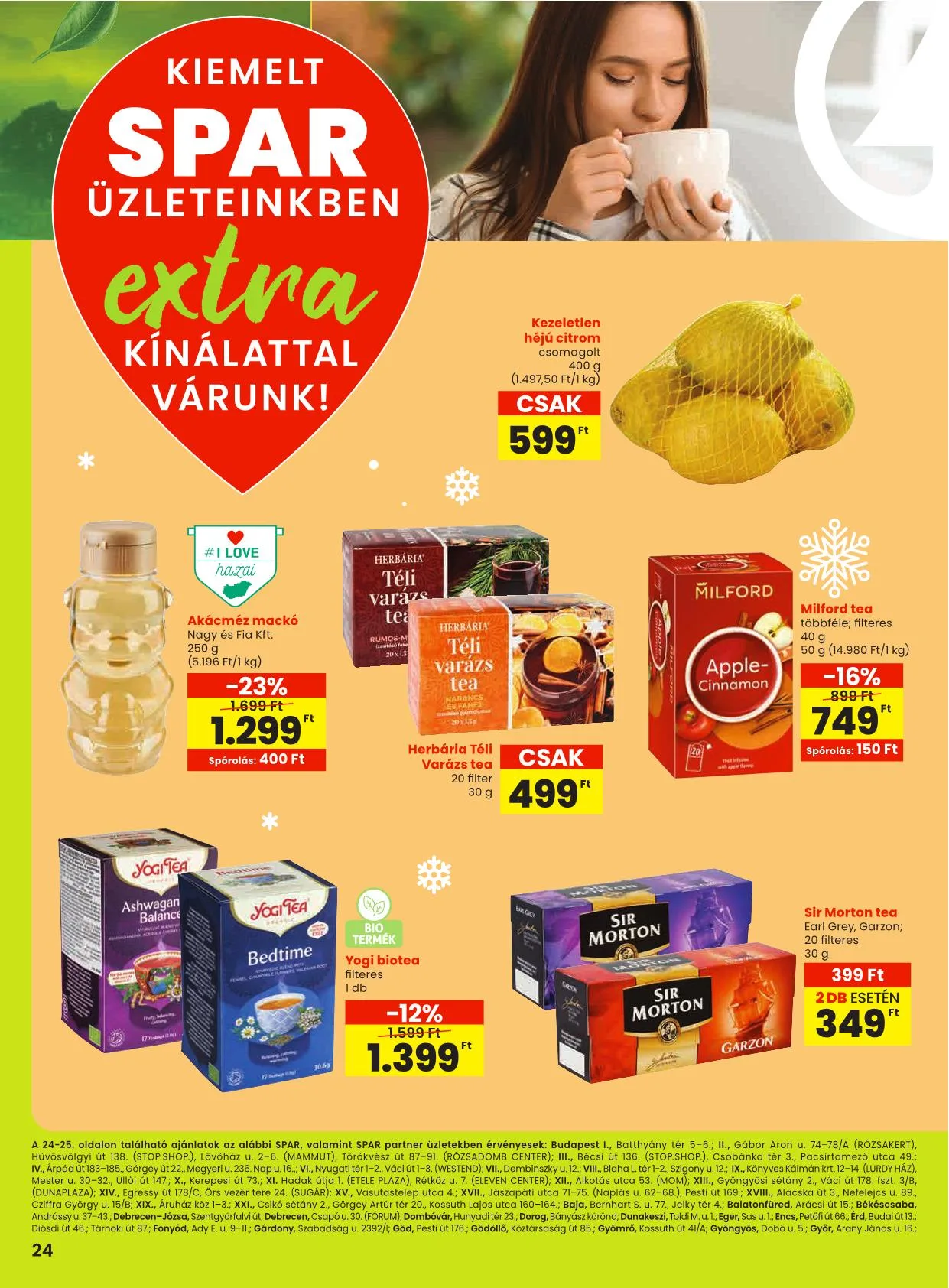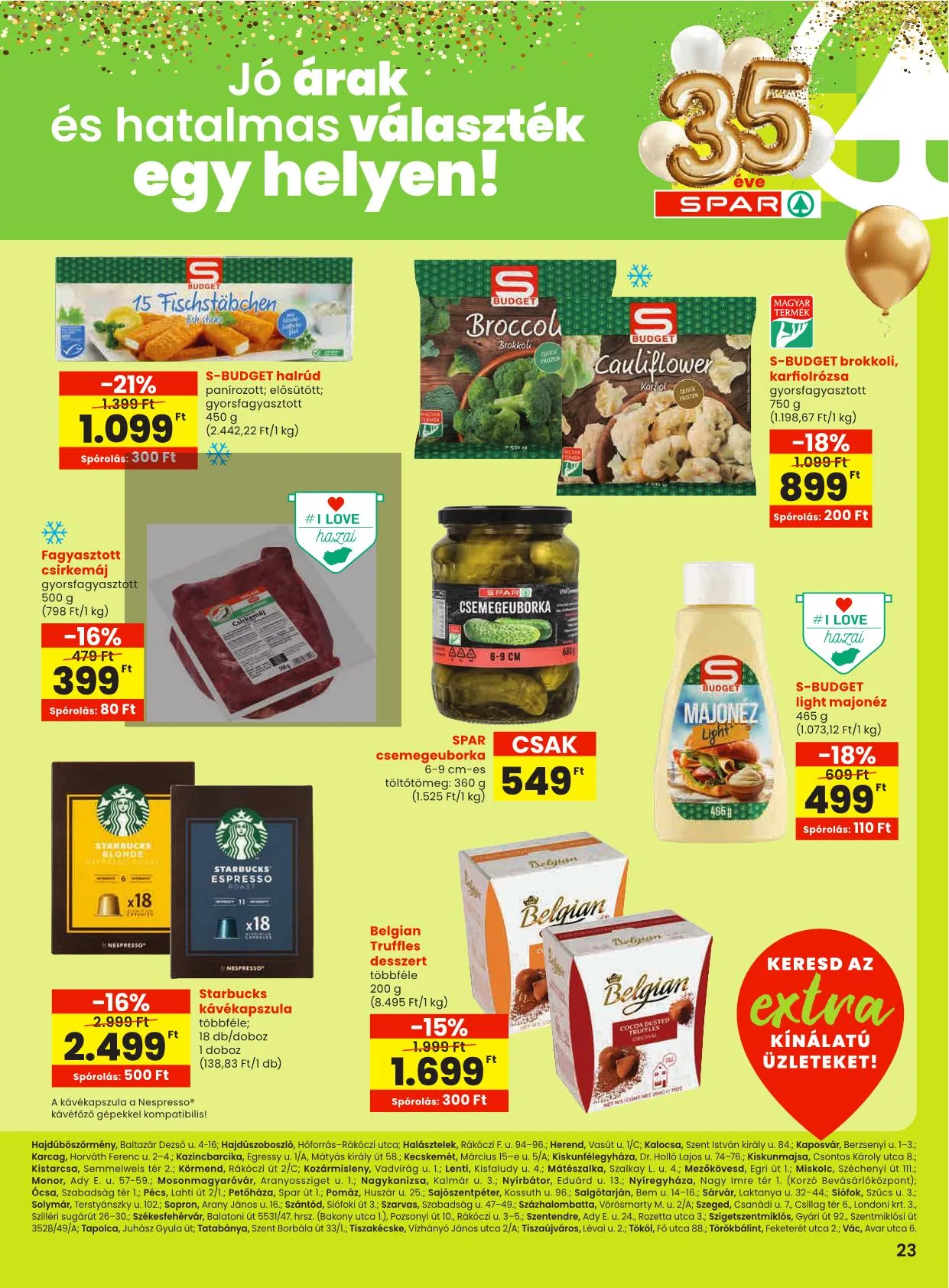 A 24-25. oldalon található ajánlatok az alábbi SPAR, valamint SPAR partner üzletekben érvényesek: Budapest I., Batthyány tér 5-6.; II., Gábor Áron u. 74-78/A (Rózsakert), Hűvösvölgyi út 138. (STOP.SHOP.), Lövőház u. 2-6. (Mammut), Törökvész út 87-91. (Rózsadomb Center); III., Bécsi út 136. (STOP.SHOP.), Csobánka tér 3., Pacsirtamező utca 49.; IV., Árpád út 183-185., Görgey út 22., Megyeri u. 236. Nap u. 16.; VI., Nyugati tér 1-2., Váci út 1-3. (Westend); VII., Dembinszky u. 12.; VIII., Blaha L. tér 1-2., Szigony u. 12.; IX., Könyves Kálmán krt. 12-14. (Lurdy Ház), Mester u. 30-32., Üllői út 147.; X., Kerepesi út 73.; XI. Hadak útja 1. (Etele Plaza), Rétköz u. 7. (Eleven Center); XII., Alkotás utca 53. (MOM); XIII., Gyöngyösi sétány 2., Váci út 178. fszt. 3/B (Dunaplaza); XIV., Egressy út 178/C, Örs vezér tere 24. (Sugár); XV., Vasutastelep utca 4.; XVII., Jászapáti utca 71-75. (Naplás u. 62-68.), Pesti út 169.; XVIII., Alacska út 3., Nefelejcs u. 89., Cziffra György u. 15/B; XIX., Áruház köz 1-3.; XXI., Csikó sétány 2., Görgey Artúr tér 20., Kossuth Lajos utca 160-164.; Baja, Bernhart S. u. 77., Jelky tér 4.; Balatonfüred, Arácsi út 15.; Békéscsaba, Andrássy u. 37-43.; Debrecen-Józsa, Szentgyörfalvi út; Debrecen, Csapó u. 30. (Fórum); Dombóvár, Hunyadi tér 23.; Dorog, Bányász körönd; Dunakeszi, Toldi M. u. 1.; Eger, Sas u. 1.; Encs, Petőfi út 66.; Érd, Budai út 13.; Diósdi út 46.; Tárnoki út 87.; Fonyód, Ady E. u. 9-11.; Gárdony, Szabadság u. 2392/1; Göd, Pesti út 176.; Gödöllő, Köztársaság út 85.; Gyömrő, Kossuth út 41/A; Gyöngyös, Dobó u. 5.; Győr, Arany János u. 16.