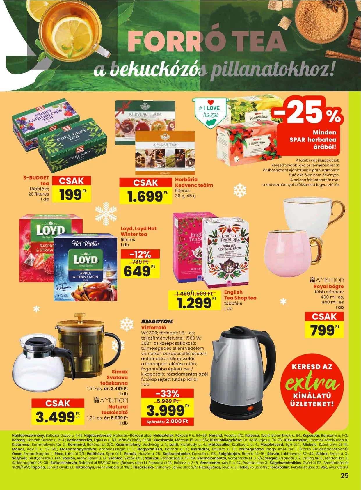 A 24-25. oldalon található ajánlatok az alábbi SPAR, valamint SPAR partner üzletekben érvényesek: Budapest I., Batthyány tér 5-6.; II., Gábor Áron u. 74-78/A (Rózsakert), Hűvösvölgyi út 138. (STOP.SHOP.), Lövőház u. 2-6. (Mammut), Törökvész út 87-91. (Rózsadomb Center); III., Bécsi út 136. (STOP.SHOP.), Csobánka tér 3., Pacsirtamező utca 49.; IV., Árpád út 183-185., Görgey út 22., Megyeri u. 236. Nap u. 16.; VI., Nyugati tér 1-2., Váci út 1-3. (Westend); VII., Dembinszky u. 12.; VIII., Blaha L. tér 1-2., Szigony u. 12.; IX., Könyves Kálmán krt. 12-14. (Lurdy Ház), Mester u. 30-32., Üllői út 147.; X., Kerepesi út 73.; XI. Hadak útja 1. (Etele Plaza), Rétköz u. 7. (Eleven Center); XII., Alkotás utca 53. (MOM); XIII., Gyöngyösi sétány 2., Váci út 178. fszt. 3/B (Dunaplaza); XIV., Egressy út 178/C, Örs vezér tere 24. (Sugár); XV., Vasutastelep utca 4.; XVII., Jászapáti utca 71-75. (Naplás u. 62-68.), Pesti út 169.; XVIII., Alacska út 3., Nefelejcs u. 89., Cziffra György u. 15/B; XIX., Áruház köz 1-3.; XXI., Csikó sétány 2., Görgey Artúr tér 20., Kossuth Lajos utca 160-164.; Baja, Bernhart S. u. 77., Jelky tér 4.; Balatonfüred, Arácsi út 15.; Békéscsaba, Andrássy u. 37-43.; Debrecen-Józsa, Szentgyörfalvi út; Debrecen, Csapó u. 30. (Fórum); Dombóvár, Hunyadi tér 23.; Dorog, Bányász körönd; Dunakeszi, Toldi M. u. 1.; Eger, Sas u. 1.; Encs, Petőfi út 66.; Érd, Budai út 13.; Diósdi út 46.; Tárnoki út 87.; Fonyód, Ady E. u. 9-11.; Gárdony, Szabadság u. 2392/1; Göd, Pesti út 176.; Gödöllő, Köztársaság út 85.; Gyömrő, Kossuth út 41/A; Gyöngyös, Dobó u. 5.; Győr, Arany János u. 16.