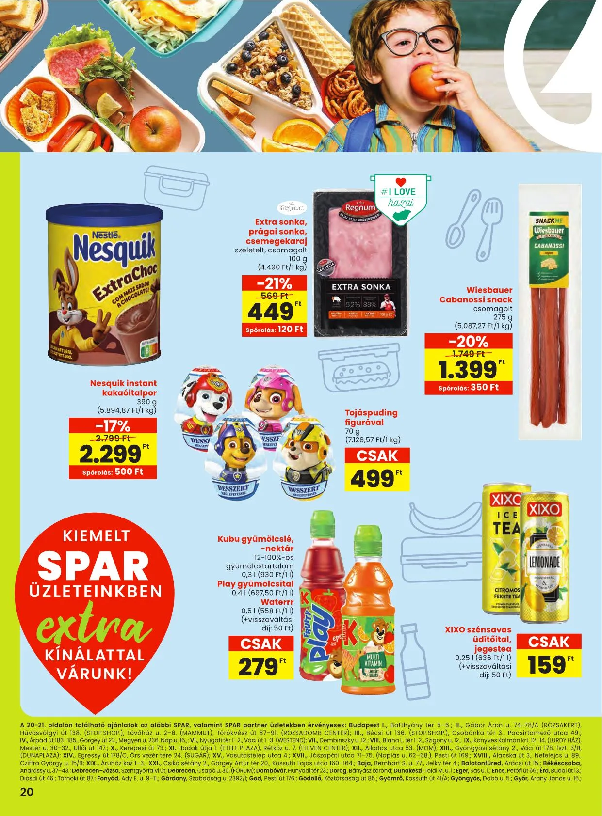 A 20-21. oldalon található ajánlatok az alábbi SPAR, valamint SPAR partner üzletekben érvényesek: Budapest I., Batthyány tér 5-6.; II., Gábor Áron u. 74-78/A (RÓZSAKERT), Hűvösvölgyi út 138. (STOP.SHOP.), Lövőház u. 2-6. (MAMMUT), Törökvész út 87-91. (RÓZSADOMB CENTER); III., Bécsi út 136. (STOP.SHOP.), Csobánka tér 3., Pacsirtamező utca 49.; IV., Árpád út 183-185., Görgey út 22., Megyeri u. 236. Nap u. 16.; VI., Nyugati tér 1-2., Váci út 1-3. (WESTEND); VII., Dembinszky u. 12.; VIII., Blaha L. tér 1-2., Szigony u. 12.; IX., Könyves Kálmán krt. 12-14. (LURDY HÁZ), Mester u. 30-32., Üllői út 147.; X., Kerepesi út 73.; XI., Hadak útja 1. (ETELE PLAZA), Rétköz u. 7. (ELEVEN CENTER); XII., Alkotás utca 53. (MOM); XIII., Gyöngyösi sétány 2., Váci út 178. fszt. 3/B (DUNAPLAZA); XIV., Egressy út 178/C, Örs vezér tere 24. (SUGÁR); XV., Vasutastelep utca 4.; XVII., Jászapáti utca 71-75. (Naplás u. 62-68.), Pesti út 169.; XVIII., Alacska út 3., Nefelejcs u. 89., Cziffra György u. 15/B; XIX., Áruház köz 1-3.; XXI., Csikó sétány 2., Görgey Artúr tér 20., Kossuth Lajos utca 160-164.; Baja, Bernhart S. u. 77., Jelky tér 4.; Balatonfüred, Arácsi út 15.; Békéscsaba, Andrássy u. 37-43.; Debrecen-Józsa, Szentgyörfalvi út; Debrecen, Csapó u. 30. (FÓRUM); Dombóvár, Hunyadi tér 23.; Dorog, Bányász körönd; Dunakeszi, Toldi M. u. 1.; Eger, Sas u. 1.; Encs, Petőfi út 66.; Érd, Budai út 13.; Diósdi út 46.; Tárnoki út 87.; Fonyód, Ady E. u. 9-11.; Gárdony, Szabadság u. 2392/1; Göd, Pesti út 176.; Gödöllő, Köztársaság út 85.; Gyömrő, Kossuth út 41/A; Gyöngyös, Dobó u. 5.; Győr, Arany János u. 16.