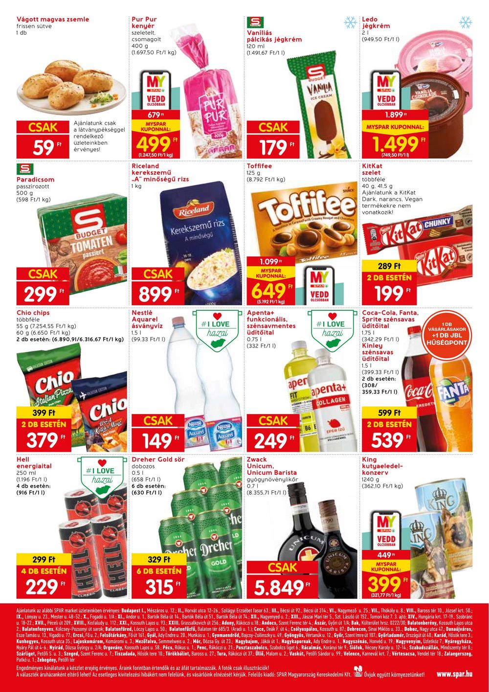 Vágott magvas zsemle frissen sütve 1 db CSAK 59ft S Paradicsom passzírozott 500 g (598 Ft/1 kg) CSAK 299 FACATION ENTON Chio 399 Ft 2 DB ESETÉN 379 Ajánlatunk csak a látványpékséggel rendelkező üzleteinkben érvényes! Italian Pizza Hell energiaital 250 ml (1.196 Ft/11) 4 db esetén: (916 Ft/1 l) BUDGET TOMATEN passiert Ft 299 Ft 4 DB ESETÉN 229t Chio chips többféle 55 g (7.254.55 Ft/1 kg) 60 g (6.650 Ft/1 kg) 1.51 2 db esetén: (6.890.91/6.316.67 Ft/1 kg) (99.33 Ft/1 1) ACATION ENTON Chio USA Ketch Manc #I LOVE hazai nor Me DE CLASSIC nnr UC Pur Pur kenyér szeletelt. CLASS csomagolt 400 g (1.697.50 Ft/1 kg) MY VEDD OLCSÓBBAN 679″ MYSPAR KUPONNAL: 499 (1.247,50 Ft/1 kg) Riceland kerekszemű ..A” minőségű rizs 1 kg CSAK 899 Nestlé Aquarel ásványvíz Ft Riceland Kerekszemű rizs A minőségű Ft CSAK 149 Dreher Gold sör dobozos 0.5 1 (658 Ft/1 l) 6 db esetén: (630 Ft/11) Ft WA PUR PUR Ter Abested Minhen 329 Ft 6 DB ESETÉN 315″ 2009 PASKE AFARA Nast Aquare #1 LOVE hazai N Aquarel www O he **** O LD her Dreher GOLD RICHA S Vaníliás pálcikás jégkrém 120 ml (1.491,67 Ft/1 l) CSAK 179ft Toffifee 125 g (8.792 Ft/1 kg) 1.099Ft MYSPAR KUPONNAL: Toffifee Alin Caramewth Creamy Sougat and Ch 649 (5.192 Ft/1 kg) Ft Apenta+ funkcionális, szénsavmentes üdítőital 0.75 1 (332 Ft/1 l) CSAK 249 Ft BUDGET VANILIA ICE CREAM Zwack Unicum, Unicum Barista gyógynövénylikór 0.71 (8.355.71 Ft/1 1) Toffifee MY W SPAIN S aper FIT apenta+ COLLAGEN CSAK 5.849 VEDD OLCSÓBBAN #I LOVE hazai WNICUM 15p Ledo XX jégkrém 21 (949,50 Ft/11) EPER 120 1790 MY VEDD OLCSÓBBAN 1.899 MYSPAR KUPONNAL: 1.499 (749,50 Ft/11) KitKat szelet többféle 40 g. 41.5 g Ajánlatunk a KitKat Dark, narancs. Vegan termékekre nem vonatkozik! 289 Ft 2 DB ESETÉN 199 KitKat CHUNKY KitKat (342,29 Ft/11) Kinley szénsavas üdítőital Coca-Cola, Fanta, Sprite szénsavas üdítőital 1,75 1 1.51 (399.33 Ft/1 1) 2 db esetén: (308/ 359.33 Ft/11) B VANILIA CSOKOLADE King kutyaeledel- konzerv 1240 g (362.10 Ft/1 kg) MY DAR 599 Ft 2 DB ESETÉN 539″ VEDD OLCSÓBBAN Ft 449 Ft MYSPAR KUPONNAL: 399 (321,77 Ft/1 kg) Ft Coca-C FANTA EREDET Ft SHETSART IN 1 DB VÁSÁRLÁSAKOR +1 DB JBL HŰSÉGPONT KING DELE UCCES Cre Ajánlatunk az alábbi SPAR market üzleteinkben érvényes: Budapest I., Mészáros u. 12.; II., Horvát utca 12-26., Szilágyi Erzsébet fasor 63.; III., Bécsi út 92., Bécsi út 314.; VI., Nagymező u. 25.; VII., Thököly u. 8.; VIII., Baross tér 10., József krt. 50.; IX., Lónyay u. 23., Mester u. 48-52.; X., Fogadó u. 1/A: XI., Andor u. 1., Bartók Béla út 14., Bartók Béla út 51., Bartók Béla út 74.; XII., Nagyenyed u. 2.; XIII., Jászai Mari tér 5., Szt. László út 152., Tomori köz 7. 3. ajtó; XIV., Hungária krt. 17-19., Szobránc u. 18-22.: XVII., Péceli út 209; XVIII., Kisfaludy u. 112.; XXI, Kossuth Lajos u. 93.; XXIII. Grassalkovich út 256.; Adony, Rákóczi u.18.; Andocs, Szent Ferenc tér 4.; Ászár, Gyóri út 1/A; Bak, Külterület hrsz. 0222/30: Balatonberény, Kossuth Lajos utca 2; Balatonfenyves, Kölcsey-Pozsonyi út sarok; Balatonfüred, Lóczy Lajos u. 50; Balatonfüzfő, Balaton tér 685/3. (Aradi u. 1.); Cece, Deák F. út 4.; Csólyospálos, Kossuth u. 87.; Debrecen, Sinai Miklós u. 33..; Doboz, Nagy utca 47.; Dunaújváros, Esze Tamás u. 13., Vigadó u. 77.; Ercsi, Fő u. 2.; Felsőtárkány, Fő út 161.: Gyál, Ady Endre u. 20., Munkás u. 1.; Gyomaendrőd, Bajcsy-Zsilinszky u. 49.; Gyöngyös, Vértanúk u. 12.; Győr, Szent Imre út 107.; Győrladamér, Országút út 40.; Karád, Hősök tere 3.; Kunhegyes, Kossuth utca 35.; Lajoskomárom, Komáromi u. 3.; Mezőfalva, Semmelweis u. 2.; Mór, Dózsa Gy. út 23.; Nagybajom, Jákói út 1; Nagykapornak, Ady Endre u. 1; Nagyszénás, Honvéd u. 19.; Nagyvenyim, Üzletköz 7.; Nyáregyháza, Nyáry Pál út 4-6.; Nyirád, Dózsa György u. 2/A; Orgovány, Kossuth Lajos u. 58.; Pécs, Rókus u. 1.; Penc, Rákóczi u. 21.; Pusztaszabolcs, Szabolcs liget 6.; Rácalmás, Korányi tér 9: Siófok, Vécsey Károly u. 12-14.; Szabadszállás, Mindszenty tér 8.; Szárliget, Petőfi S. u. 3.; Szeged, Szent Ferenc u. 7.; Tiszadada, Hősök tere 10.; Törökbálint, Baross u. 27.; Tura, Rákóczi út 37.; Üllő, Malom u. 2.; Vaskút, Petőfi Sándor u. 99.; Velence, Karnevál krt. 7.; Vértesacsa, Vendel tér 18.; Zalaegerszeg, Patkó u. 1.; Zebegény, Petőfi tér Engedményes kínálatunk a készlet erejéig érvényes. Áraink forintban értendők és az áfát tartalmazzák. A fotók csak illusztrációk! N A választék áruházanként eltérő lehet! Az esetleges kivitelezési hibákért nem felelünk, és vásárlóink elnézését kérjük. Felelős kiadó: SPAR Magyarország Kereskedelmi Kft. Óvjuk együtt környezetünket! www.spar.hu
