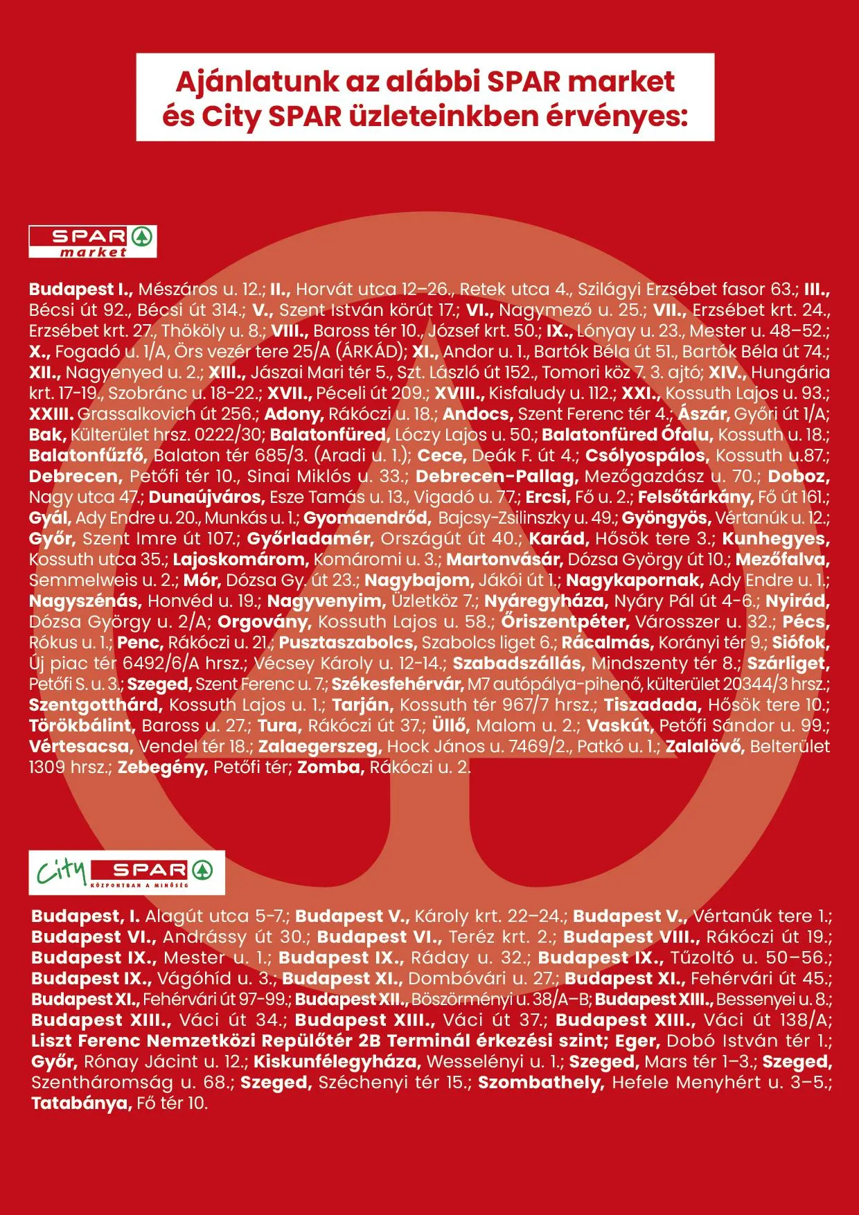 Ajánlatunk az alábbi SPAR market és City SPAR üzleteinkben érvényes: