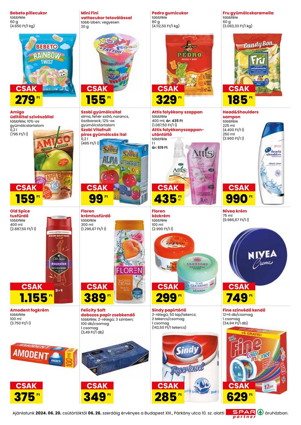 Bebeto pillecukor többféle 60 g (4.650 Ft/1 kg) Mini Fini vattacukor tetoválással több ízben; vegyesen 20 g Pedro gumicukor többféle 80 g (4.112,50 Ft/1 kg) Fru gyümölcskaramella többféle 60 g (3.083,33 Ft/1 kg) BEBETO RAINBOW TWIST TATTOO PEDRO MUNDO BEARS Candy Bon Fra CSAK SHMALLOW 279″ Amigo üdítőital szívószállal többféle; 10%-os gyümölcstartalom 0,21 (795 Ft/11) AMIGO CSAK 155″ Szobi gyümölcsital alma, fehér szőlő, narancs, öszibarack; 12%-os gyümölcstartalom Szobi Vitafruit piros gyümölcsös ital 0,21 (495 Ft/11) SZOB SZOB ALMA MITATUIT CSAK 329″ Attis folyékony szappan többféle 400 ml; ár: 435 Ft (1.087,50 Ft/11) Attis folyékonyszappan- utántöltő többféle 11 ár: 619 Ft Attis CSAK Attis CSAK 159″ Old Spice tusfürdő többféle 400 ml (2.887,50 Ft/11) APPLE CSAK 99″ Floren krémtusfürdő többféle 300 ml (1.296,67 Ft/11) 2L 435** Le Floren kézkrém többféle 100 ml (2.990 Ft/11) CSAK 185 Ft Head&Shoulders sampon többféle 225 ml (4.400 Ft/11) 250 ml (3.960 Ft/11) CSAK 990″ Nivea krém 75 ml (9.986,67 Ft/11) PERFUME QUALITY SCINT Old Space ROCKSTAR GLICERINES heads shoulders classic clean NIVEA Crome CSAK 1.155″ Amodent fogkrém többféle 100 ml (3.750 Ft/11) 31 AMODENT AMODENT EREDETI CSAK 375″ 100ml CSAK 389″ Felicity Soft FLOREN SHOWER CREAM dobozos papír zsebkendő többféle; 2-rétegű; 3 színben; 100 db/csomag 1 csomag (3,49 Ft/1 db) CSAK 349″ CSAK Ft 299ft GLICERINES KÉZKREM Sindy papírtörlő 2-rétegű; 50 lap/tekercs; 2 tekercs/csomag 1 csomag (142,50 Ft/1 tekercs) Sindy Pipertand CSAK 285Ft Ajánlatunk 2024. 06. 20. csütörtöktől 06. 26. szerdáig érvényes a Budapest XIII., Párkány utca 10. sz. alatti CSAK 749″ Fine színvédő kendő 12+6 db/csomag 1 csomag (34,94 Ft/1 db) Well +6 GRATIS! Fine CSAK Color magnet 629′ Ft SPAR partner 12pcs áruházban.
