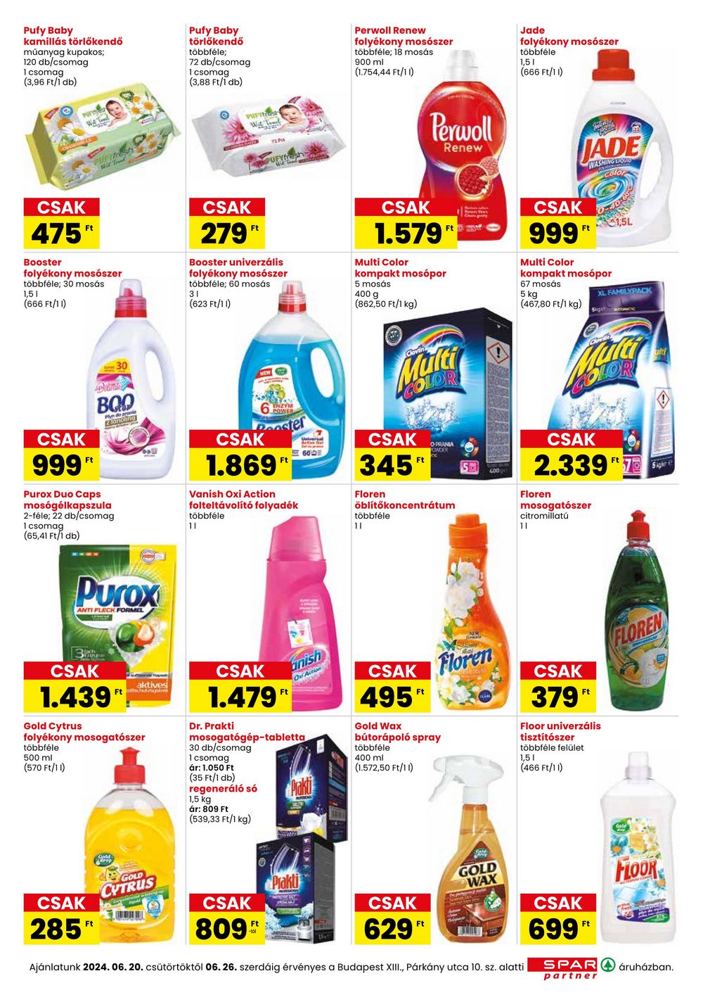 Pufy Baby kamillás törlőkendő műanyag kupakos; 120 db/csomag 1 csomag (3,96 Ft/1 db) Pufy Baby törlőkendő többféle; 72 db/csomag 1 csomag (3,88 Ft/1 db) PUFITISH Wit Toml PUFYfresh Perwoll Renew folyékony mosószer többféle; 18 mosás 900 ml (1.754,44 Ft/11) Jade folyékony mosószer többféle 1,51 (666 Ft/11) Perwoll Renew JADE WASHING BROMID Color CSAK 475″ Booster folyékony mosószer többféle; 30 mosás 1,51 (666 Ft/11) CSAK 279″ Booster univerzális folyékony mosószer többféle; 60 mosás 31 (623 Ft/11) CSAK 1.579′ Multi Color kompakt mosópor 5 mosás 400 g (862,50 Ft/1 kg) CSAK 31,5L 999″ Multi Color kompakt mosópor 67 mosás 5 kg (467,80 Ft/1 kg) XL FAMILYPACK CSAK 999″ 30 Danie BOO Ekindling Purox Duo Caps mosógélkapszula 2-féle; 22 db/csomag 1 csomag (65,41 Ft/1 db) Dester CSAK 1.869″ Vanish Oxi Action folteltávolító folyadék többféle 11 Cloven Multi CSAK 345″ Floren OPRANIA OWDER öblítőkoncentrátum többféle 11 Purox ANTI FLECK FORMEL LOR utd 5 CSAK 2.3397 Floren mosogatószer citromillatú 11 Sigher e CSAK 1.439″ Gold Cytrus aktives Ft. folyékony mosogatószer többféle 500 ml (570 Ft/11) CSAK Ft 1.479″ Dr. Prakti anish On Action mosogatógép-tabletta 30 db/csomag 1 csomag ár: 1.050 Ft (35 Ft/1 db) regeneráló só 1,5 kg ár: 809 Ft (539,33 Ft/1 kg) Paki CSAK 495″ Gold Wax bútorápoló spray többféle 400 ml (1.572,50 Ft/11) Floren CSAK 379″ Floor univerzális tisztítószer többféle felület 1,51 (466 Ft/11) FLOREN CSAK 285 Ft GOLD CYTRUS CSAK Prakti 809** GOLD WAX CSAK CSAK 629 Ft Ft Ajánlatunk 2024. 06. 20. csütörtöktől 06.26. szerdáig érvényes a Budapest XIII., Párkány utca 10. sz. alatti 699 SPAR partner Hook áruházban.
