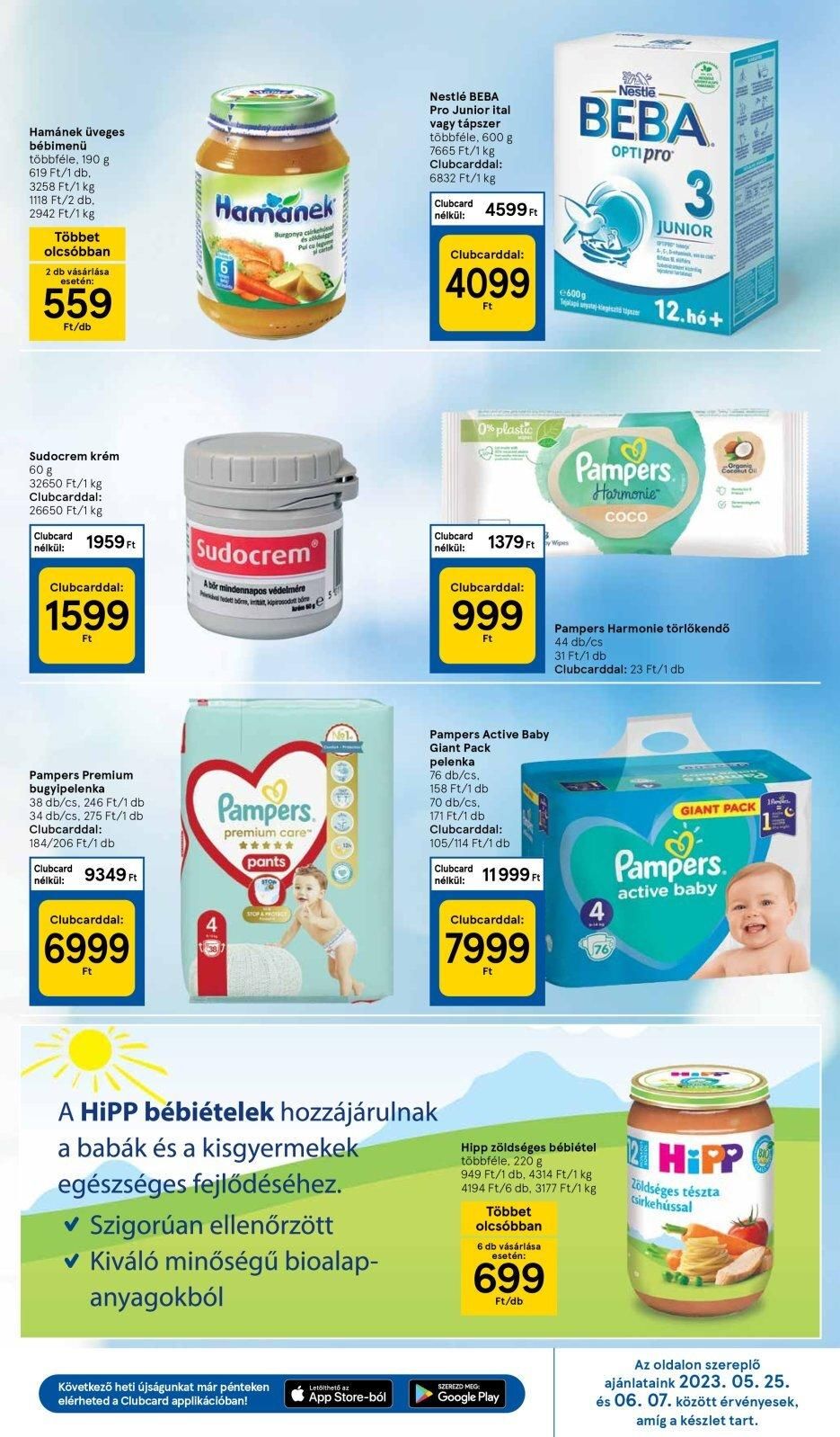 Hamánek üveges bébimenü többféle, 190 g 619 Ft/1 db. 3258 Ft/1 kg 1118 Ft/2 db. 2942 Ft/1 kg Többet olcsóbban 2 db vásárlása esetén: 559 Ft/db Sudocrem krém 60 g 32650 Ft/1 kg Clubcarddal: 26650 Ft/1 kg Clubcard nélkül: 1959 Ft Clubcarddal: 1599 Ft Pampers Premium bugyipelenka 38 db/cs, 246 Ft/1 db 34 db/cs, 275 Ft/1 db Clubcarddal: 184/206 Ft/1 db 9349 Ft Clubcard nélkül: Clubcarddal: 6999 Hamanek mitind c Burgonya cairk és a Pui cu legume old Sudocrem A bör mindennapos védelmére Tedett böre, intat, kipirosodu Pampers. premium care” ✰✰✰✰✰ pants 18 SOPANO Következő heti újságunkat már pénteken elérheted a Clubcard applikációban! Nestlé BEBA Pro Junior ital vagy tápszer többféle, 600 g 7665 Ft/1 kg Clubcarddal: 6832 Ft/1 kg Letölthető az App Store-ból Clubcard nélkül: Clubcard nélkül: A HiPP bébiételek hozzájárulnak a babák és a kisgyermekek egészséges fejlődéséhez. Szigorúan ellenőrzött ✓ Kiváló minőségű bioalap- anyagokból Clubcarddal: 4099 Ft 4599 Ft Clubcard nélkül: 0% plastic 1379 Ft Clubcarddal: 999 Ft Pampers Active Baby Giant Pack pelenka 76 db/cs. 158 Ft/1 db 70 db/cs, 171 Ft/1 db Clubcarddal: 105/114 Ft/1 db 11999 Ft Clubcarddal: 7999 Ft Többet olcsóbban 6 db vásárlása esetén: 699 Ft/db Nestle BEBA OPTI pro SZEREZD MEG Google Play €600g Tejalapi nyataj-kegiat tip Hipp zöldséges bébiétel többféle, 220 g 949 Ft/1 db, 4314 Ft/1 kg 4194 Ft/6 db, 3177 Ft/1 kg JUNIOR 76 4,5, Pampers Harmonie COCO 12.hó+ Orgent Pampers Harmonie törlőkendő 44 db/cs 31 Ft/1 db. Clubcarddal: 23 Ft/1 db 819 11 GIANT PACK Pampers. active baby 21 HiPP Zöldséges tészta csirkehússal Hand Az oldalon szereplő ajánlataink 2023. 05. 25. és 06. 07. között érvényesek, amíg a készlet tart.