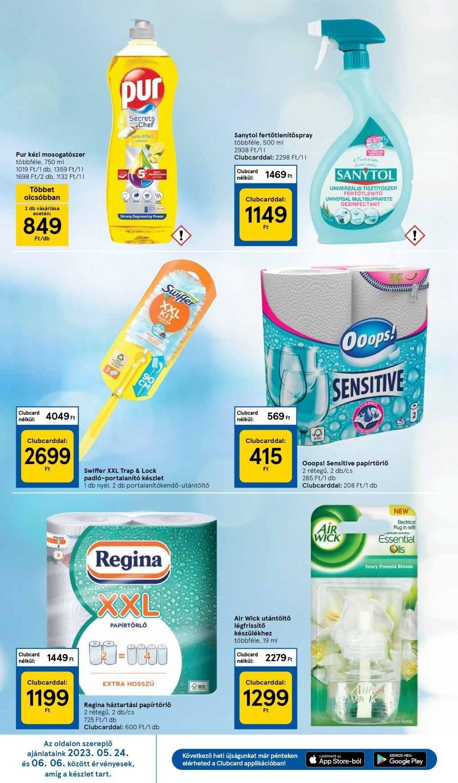 Pur kézi mosogatószer többféle, 750 ml 1019 Ft/1 db, 1359 Ft/11 1698 Ft/2 db, 1132 Ft/11 Többet olcsóbban 2 db vásárlása esetén: 849 Ft/db Clubcard nélkül: 4049 Ft Clubcarddal: 2699 Ft Clubcard nélkül: 1449 Ft Clubcarddal: 1199 Ft pur Secrets Chef Soda Effect DEGREASING Strong Degreasing Power TRAPLOC Swiffer XXL Trap & Lock padló-portalanító készlet 1 db nyél, 2 db portalanítókendő-utántöltő Regina XXL PAPÍRTÖRLŐ Swiffer KIT DUSTER -Utji EXTRA HOSSZÚ Az oldalon szereplő ajánlataink 2023. 05. 24. és 06. 06. között érvényesek, amíg a készlet tart. Regina háztartási papírtörlő 2 rétegű, 2 db/cs 725 Ft/1 db Clubcarddal: 600 Ft/1 db. Sanytol fertőtlenítőspray többféle, 500 ml 2938 Ft/11 Clubcarddal: 2298 Ft/11 Clubcard nélkül: Clubcarddal: 1149 Ft Clubcard nélkül: 1469 Ft 569 Ft Clubcarddal: 415 Ft Clubcard nélkül: Air Wick utántöltő légfrissítő készülékhez többféle, 19 ml 2279 Ft Clubcarddal: 1299 Ft Következő heti újságunkat már pénteken elérheted a Clubcard applikációban! A Ticte trate SANYTOL UNIVERZÁLIS TISZTÍTÓSZER FERTŐTLENÍTO UNIVERSAL MULTISUPRAFETE DEZINFECTANT Ooops! SENSITIVE 18 Ooops! Sensitive papírtörlő 2 rétegű, 2 db/cs 285 Ft/1 db Clubcarddal: 208 Ft/1 db AIR WICK AUR w Letölthető az App Store-ból NEW Electrical Plug In refill IN NATURAL Essential Oils Ivory Freesia Bloom ck Refil SZEREZD MEG Google Play