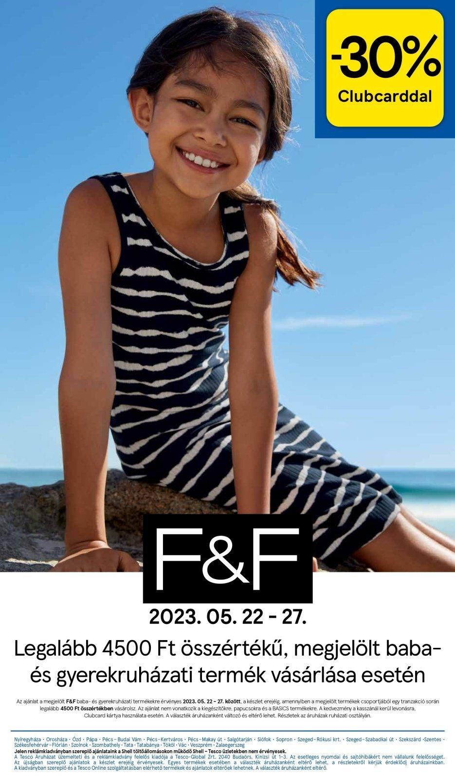 -30% Clubcarddal F&F 2023. 05. 22 – 27. Legalább 4500 Ft összértékű, megjelölt baba- és gyerekruházati termék vásárlása esetén Az ajánlat a megjelölt F&F baba- és gyerekruházati termékekre érvényes 2023. 05. 22 – 27. között, a készlet erejéig, amennyiben a megjelölt termékek csoportjából egy tranzakció során legalább 4500 Ft összértékben vásárolsz. Az ajánlat nem vonatkozik a kiegészítőkre, papucsokra és a BASICS termékekre. A kedvezmény a kasszánál kerül levonásra, Clubcard kártya használata esetén. A választék áruházanként változó és eltérő lehet. Részletek az áruházak ruházati osztályán. Nyíregyháza Orosháza Ózd Pápa Pécs-Budai Vám Pécs-Kertváros Pécs-Makay út – Salgótarján Siófok Sopron Szeged-Rókusi krt. Szeged-Szabadkai út Szekszárd Szentes. Székesfehérvár-Flórián Szolnok Szombathely Tata Tatabánya Tököl Vác Veszprém Zalaegerszeg Jelen reklámkiadványban szereplő ajánlataink a Shell töltőállomásokon működő Shell – Tesco üzletekben nem érvényesek. A Tesco Áruházat üzemelteti és a reklámkiadvány felelős kiadója a Tesco-Global Zrt. 2040 Budaörs, Kinizsi út 1-3. Az esetleges nyomdai és sajtóhibákért nem vállalunk felelősséget. Az újságban szereplő ajánlatok a készlet erejéig érvényesek. Egyes termékek esetében a választék áruházanként eltérő lehet, a részletekről kérjük érdeklődj áruházainkban. A kiadványban szereplő és a Tesco Online szolgáltatásban elérhető termékek és ajánlatok eltérőek lehetnek. A választék áruházanként eltérő.