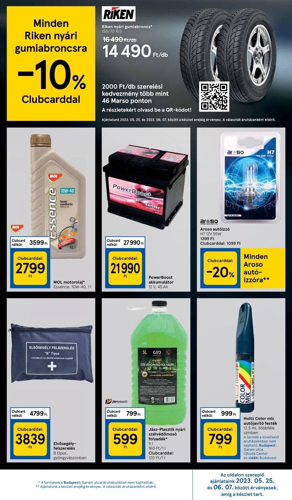 Minden Riken nyári gumiabroncsra 14 490 Ft/db 16-490 Ft/db -10% Clubcarddal MOL Clubcard nélkül: 3599 Ft Clubcarddal: 2799 Ft Essence MOL Clubcard 4799 Ft nélkül: Clubcarddal: 3839 Ft 10W-40 Semi- synthetic 1Le ELSŐSEGÉLY FELSZERELÉS „B” Tipus A6/180(N12) KEHEM rendelethak megfele MOL motorolaj* Essence, 10W-40, 11 RIKEN Riken nyári gumiabroncs* 155/70 R13 Elsősegély- felszerelés B típus. gyöngyvászonban 2000 Ft/db szerelési kedvezmény több mint 46 Marso ponton A részletekért olvasd be a QR-kódot! Ajánlatunk 2023. 05. 25. és 2023. 06. 07. között a készlet erejéig érvényes. A választék áruházanként eltérő. PowerBoost Clubcard nélkül: 27 990 Ft Clubcarddal: 21990 Ft JP Jás plasztic Clubcard nélkül: 799 Ft Clubcarddal: 599 Ft BATTERY 5L PowerBoost akkumulátor 12 V, 45 Ah SA nyári SZELVEDOMOSO FOLYADÉK 12 19 Jász-Plasztik nyári szélvédőmosó folyadék* 51 160 Ft/11 Clubcarddal: 120 Ft/11 OXO * A termékek a Budapest: Garam utcai áruházunkban nem kaphatóak. ** Ajánlatunk a készlet erejéig érvényes. A választék áruházanként eltérő. are so areso Aroso autóizzó H7 12V 55W 1399 Ft Clubcarddal: 1099 Ft Clubcard nélkül: Minden Clubcarddal: Aroso -20% autó- 999 Ft Clubcarddal: 799 Ft H7 12V 55W PX266 izzóra** COLOR 688 Holtz Color mix autójavító festék 12,5 ml, többféle színben. A termék a következő áruházainkban nem kapható: Budapest: Garam utca, Újbuda Center és vidék: Budakeszi. Az oldalon szereplő ajánlataink 2023. 05. 25. és 06. 07. között érvényesek, amíg a készlet tart.