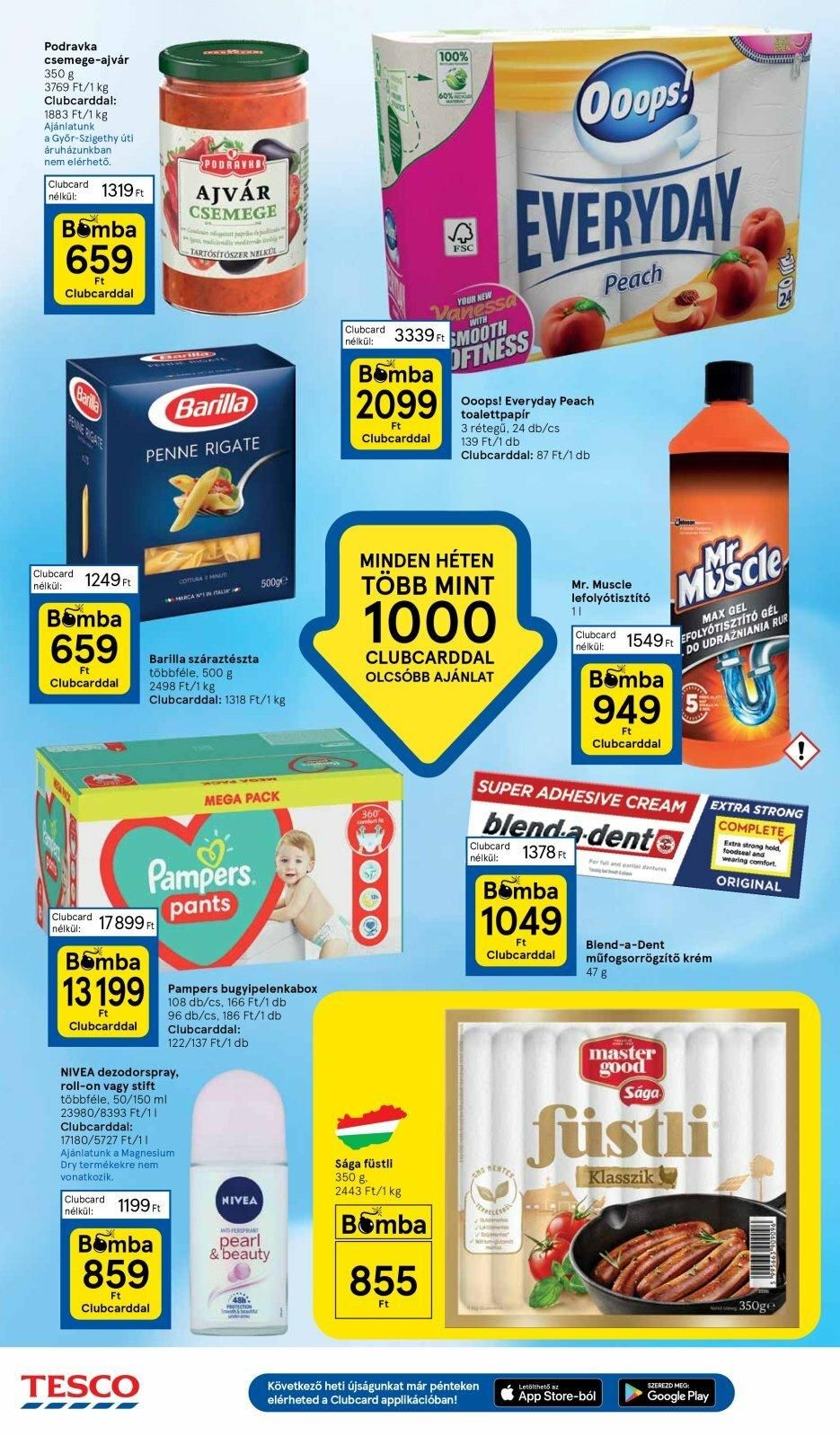 Podravka csemege-ajvár 350 g 3769 Ft/1 kg Clubcarddal: 1883 Ft/1 kg Ajánlatunk a Győr-Szigethy úti áruházunkban nem elérhető. Clubcard 1319 Ft nélkül: Bomba 659 Ft Clubcarddal Baila Clubcard 1249 Ft nélkül: Bomba 659 Ft Clubcarddal Bomba 13 199 Ft Clubcarddal Clubcard nélkül: Clubcard 17899 Ft nélkül: PENNE RIGATE O TESCO PODRAVHA AJVÁR CSEMEGE Barilla 1199 Ft tradicionalm TARTÓSÍTÓSZER NELKOL NIVEA dezodorspray, roll-on vagy stift többféle, 50/150 ml 23980/8393 Ft/11 Clubcarddal: 17180/5727 Ft/11 Ajánlatunk a Magnesium Dry termékekre nem vonatkozik. Bomba 859 Ft Clubcarddal Barilla száraztészta többféle, 500 g 2498 Ft/1 kg Clubcarddal: 1318 Ft/1 kg S Pampers. pants COTTURA AUT MARCA Nº1 IN ITALI 500g MEGA PACK Pampers bugyipelenkabox 108 db/cs, 166 Ft/1 db 96 db/cs, 186 Ft/1 db Clubcarddal: 122/137 Ft/1 db NIVEA AND PERSPRANT pearl & beauty Clubcard 3339 Ft nélkül: Bomba 2099 Ft Clubcarddal 100% 360 000 Sága füstli 350 g. 2443 Ft/1 kg Bomba FSC YOUR NEW Vanessa MINDEN HÉTEN TÖBB MINT 855 Ft 1000 CLUBCARDDAL OLCSÓBB AJÁNLAT WITH SMOOTH OFTNESS Ooops! EVERYDAY Peach Ooops! Everyday Peach toalettpapír 3 rétegű, 24 db/cs 139 Ft/1 db Clubcarddal: 87 Ft/1 db Következő heti újságunkat már pénteken elérheted a Clubcard applikációban! Bomba 1049 Ft Clubcarddal CRECLESAL Mr. Muscle lefolyótisztító 11 Mr Muscle 1549 Ft EFOLYÓTISZTÍTÓ GÉL MAX GEL DO UDRAŻNIANIA RUR Clubcard nélkül: SUPER ADHESIVE CREAM blend-a-dente Clubcard 1378 Ft nélkül: Bomba 949 Ft Clubcarddal For full and partial dentures Close Blend-a-Dent műfogsorrögzítő krém 47 g master good Letölthető az App Store-ból Sága füstli Klasszik EXTRA STRONG COMPLETE Extra strong hold, foodseal and wearing comfort. ORIGINAL SZEREZD MEG: Google Play 350ge