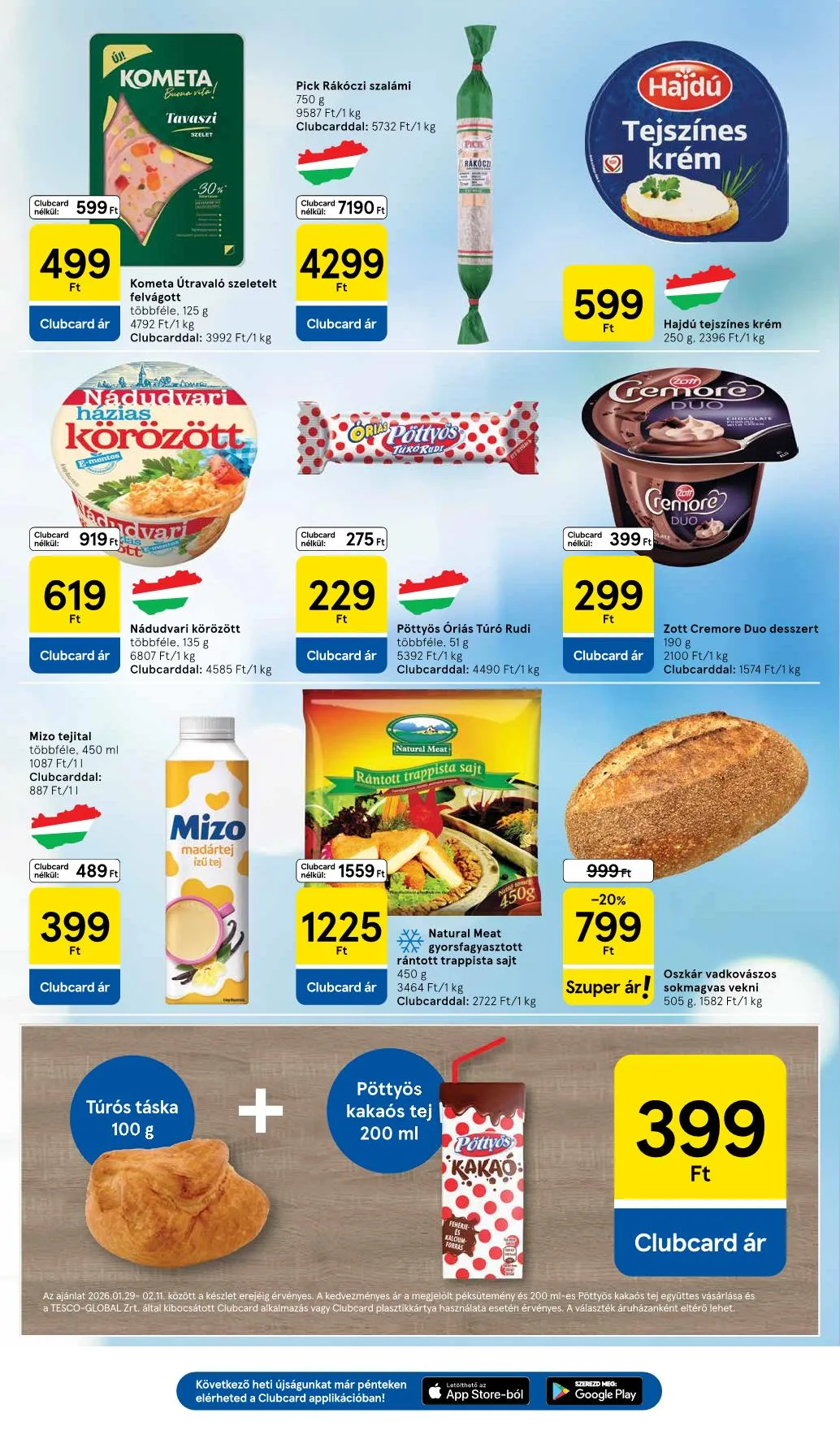 Az ajánlat 2026.01.29-02.11. között a készlet erejéig érvényes. A kedvezményes ár a megjelölt péksütemény és a 200 ml-es Pöttyös kakaós tej együttes vásárlása és a TESCO-GLOBAL Zrt. által kibocsátott Clubcard alkalmazás vagy Clubcard plasztikkártya használata esetén érvényes. A választék áruházanként eltérő lehet.