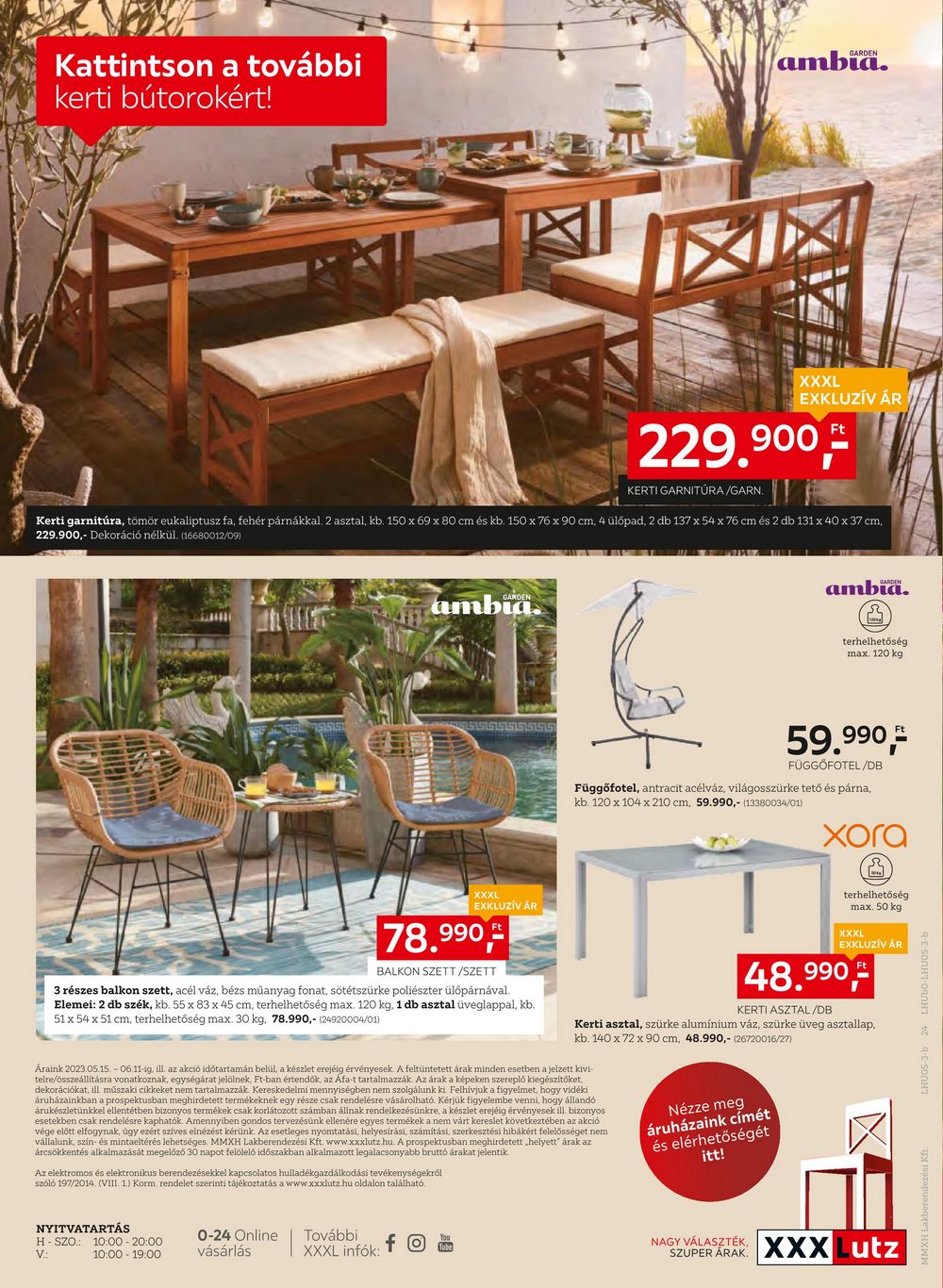 Kattintson a további kerti bútorokért! 4644 GA 415075151.50 19332 NYITVATARTÁS H-SZO: 10:00 – 20:00 V.: 10:00 – 19:00 Kerti garnitúra, tömör eukaliptusz fa, fehér párnákkal. 2 asztal, kb. 150 x 69 x 80 cm és kb. 150 x 76 x 90 cm, 4 ülőpad, 2 db 137 x 54 x 76 cm és 2 db 131 x 40 x 37 cm, 229.900,- Dekoráció nélkül. (16680012/09) Az elektromos és elektronikus berendezésekkel kapcsolatos hulladékgazdálkodási tevékenységekről szóló 197/2014. (VIII. 1.) Korm. rendelet szerinti tájékoztatás a www.xxxlutz.hu oldalon található. 51515151 78.990 BALKON SZETT/SZETT 3 részes balkon szett, acél váz, bézs műanyag fonat, sötétszürke poliészter ülőpárnával. Elemei: 2 db szék, kb. 55 x 83 x 45 cm, terhelhetőség max. 120 kg, 1 db asztal üveglappal, kb. 51 x 54 x 51 cm, terhelhetőség max. 30 kg. 78.990,- (24920004/01) 0-24 Online További vásárlás XXXL infók: | GARDEN XXXL EXKLUZÍV ÁR Ft You Áraink 2023.05.15. – 06.11-ig, ill. az akció időtartamán belül, a készlet erejéig érvényesek. A feltüntetett árak minden esetben a jelzett kivi- telre/összeállításra vonatkoznak, egységárat jelölnek, Ft-ban értendők, az Áfa-t tartalmazzák. Az árak a képeken szereplő kiegészítőket. dekorációkat, ill. műszaki cikkeket nem tartalmazzák. Kereskedelmi mennyiségben nem szolgálunk ki. Felhívjuk a figyelmet, hogy vidéki áruházainkban a prospektusban meghirdetett termékeknek egy része csak rendelésre vásárolható. Kérjük figyelembe venni, hogy állandó árukészletünkkel ellentétben bizonyos termékek csak korlátozott számban állnak rendelkezésünkre, a készlet erejéig érvényesek ill. bizonyos esetekben csak rendelésre kaphatók. Amennyiben gondos tervezésünk ellenére egyes termékek a nem várt kereslet következtében az akció vége előtt elfogynak, úgy ezért szíves elnézést kérünk. Az esetleges nyomtatási, helyesírási, számítási, szerkesztési hibákért felelősséget nem vállalunk, szín- és mintaeltérés lehetséges. MMXH Lakberendezési Kft. www.xxxlutz.hu. A prospektusban meghirdetett helyett” árak az árcsökkentés alkalmazását megelőző 30 napot felölelő időszakban alkalmazott legalacsonyabb bruttó árakat jelentik X KERTI GARNITÚRA/GARN. ambia. 229.900, XXXL EXKLUZÍV ÁR GARDEN AZ EL Nézze meg áruházaink címét és elérhetőségét itt! ambia. terhelhetőség max. 120 kg. Függőfotel, antracit acélváz, világosszürke tető és párna, kb. 120 x 104 x 210 cm, 59.990,- (13380034/01) 59.9⁹⁹90, FÜGGŐFOTEL/DB 48.9⁹0,- KERTI ASZTAL/DB Kerti asztal, szürke alumínium váz, szürke üveg asztallap, kb. 140 x 72 x 90 cm, 48.990,- (26720016/27) Ft xora (3) terhelhetőség max. 50 kg. XXXL EXKLUZÍV ÁR NAGY VÁLASZTÉK XXX Lutz SZUPER LHU05-3-b 24 LHUBO-LHUOS-3 akberendezési Kft.